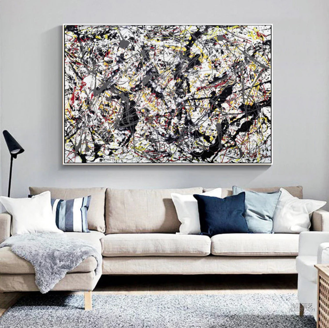 Introducing 'Chroma,' a captivating abstract painting that catches your eye. Bursting with black, red, yellow, and grey colors against a white background, it creates an exciting and energetic display. This stunning artwork is perfect for creating a lively and vibrant atmosphere anywhere.