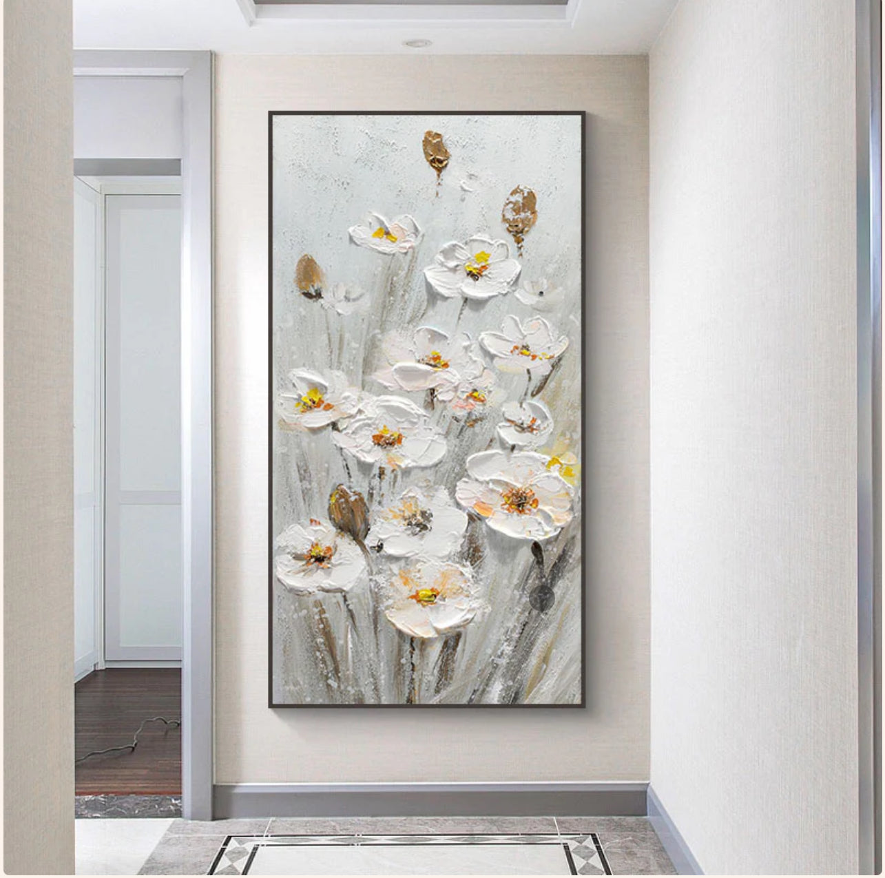 Lovely, white daffodils dangle beautifully on the gentle flow of the wind to create a merry sight. Through the use of various painting techniques, it almost seems as if the flowers dance right out of their canvas, creating a dynamic, floral atmosphere wherever it's portrayed!