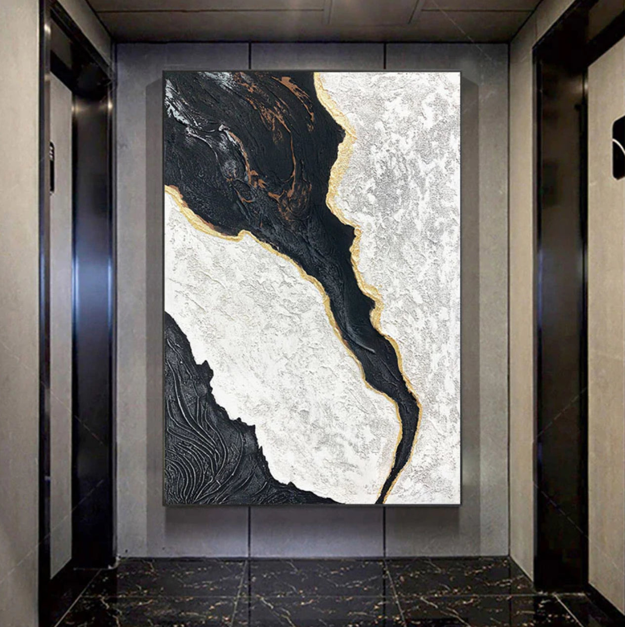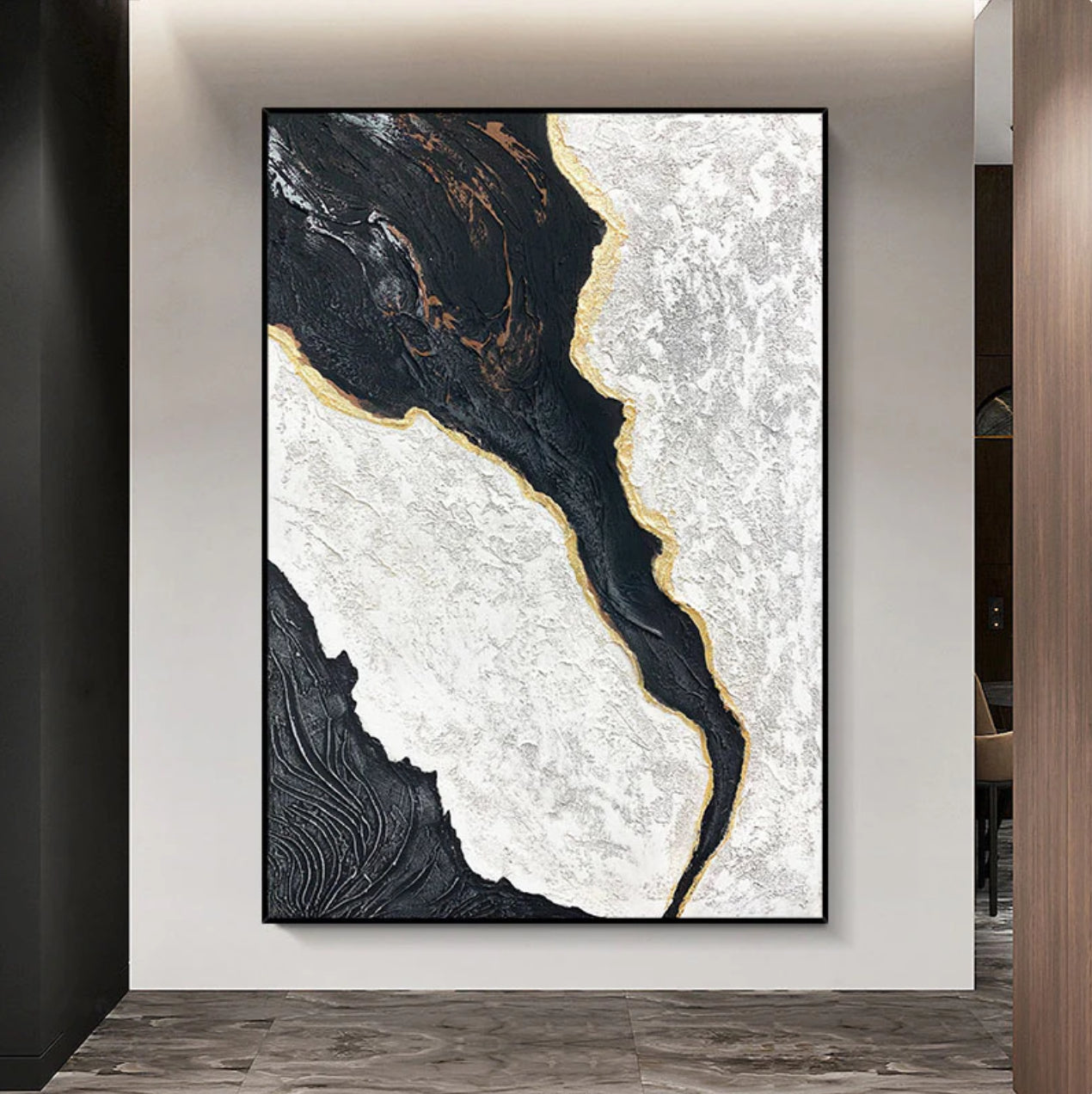 Dark Flow captures the striking contrast between light and dark, with a golden streak flowing like liquid energy. This bold statement piece feels alive, commanding attention in any space. Let the powerful motion of this artwork light up your interior with its elegance and mystery.