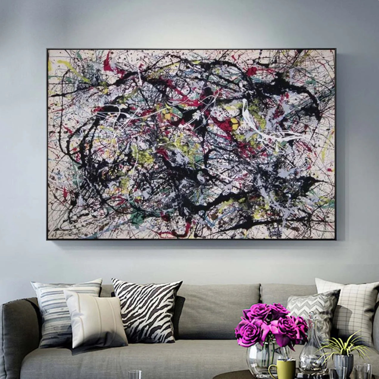 This modern art piece radiates lively energy. Twisting brushstrokes and vibrant bursts of color form a captivating display of abstract expression. The chaotic composition, where colors and shapes mix harmoniously in a rhythmic dance, keeps you interested, time after time!