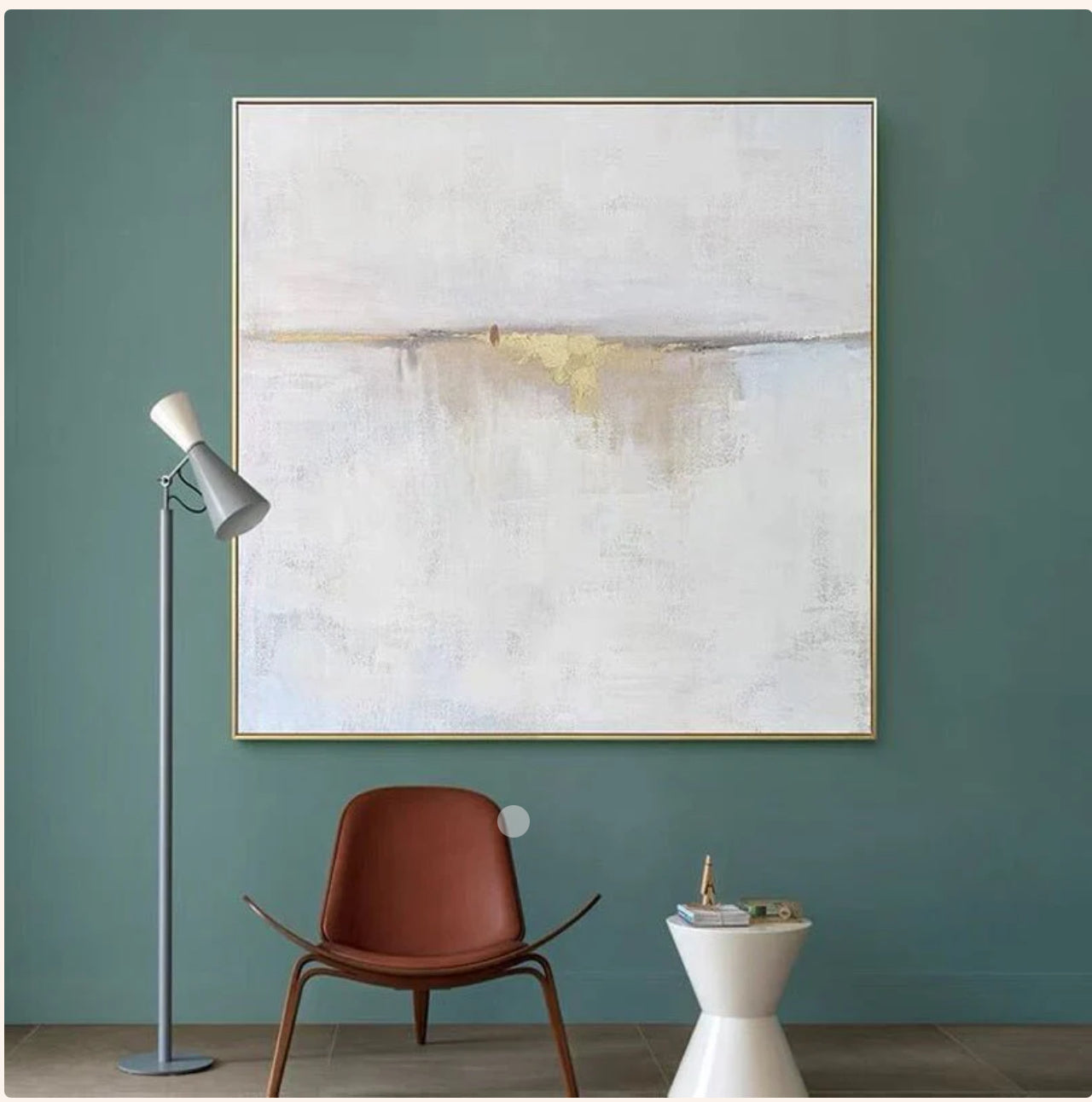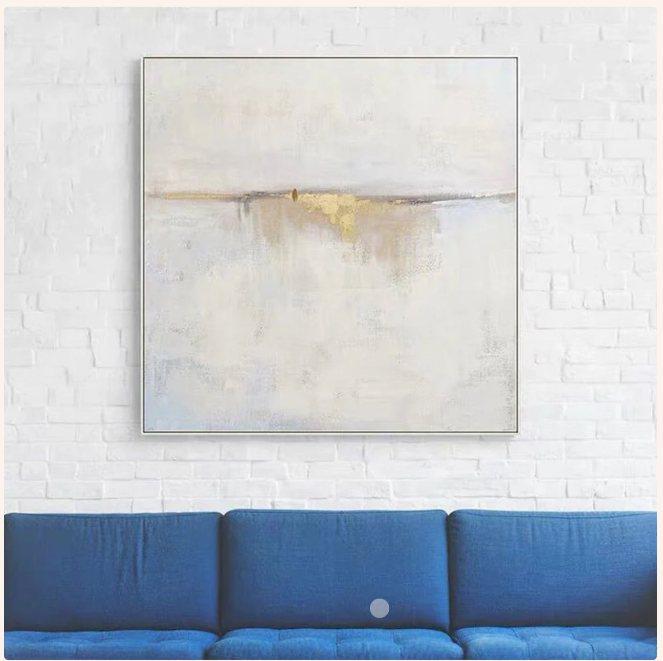 This artwork feels like the horizon on a foggy morning—calm, vast, and full of possibility. Its soft colors and golden accents make it a perfect choice for spaces where simplicity meets sophistication.