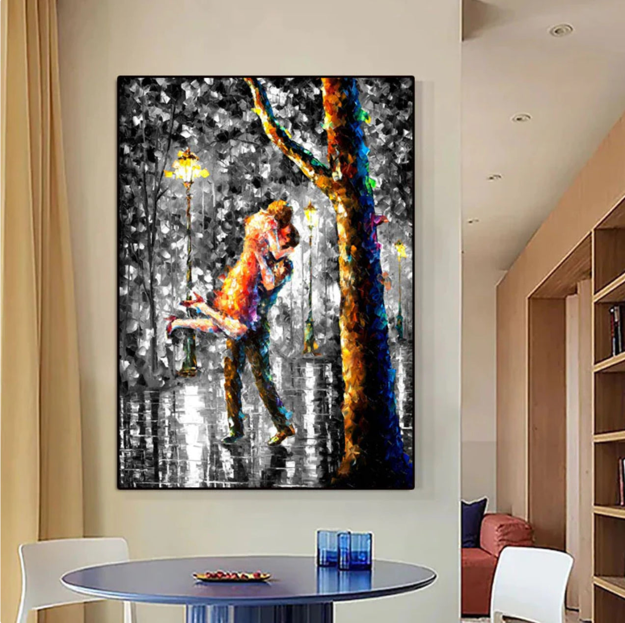 This painting tells the story of a love that’s just beginning, with two people lost in a moment of pure joy. The dynamic colors and lively composition make it an ideal piece for celebrating the magic of romance.