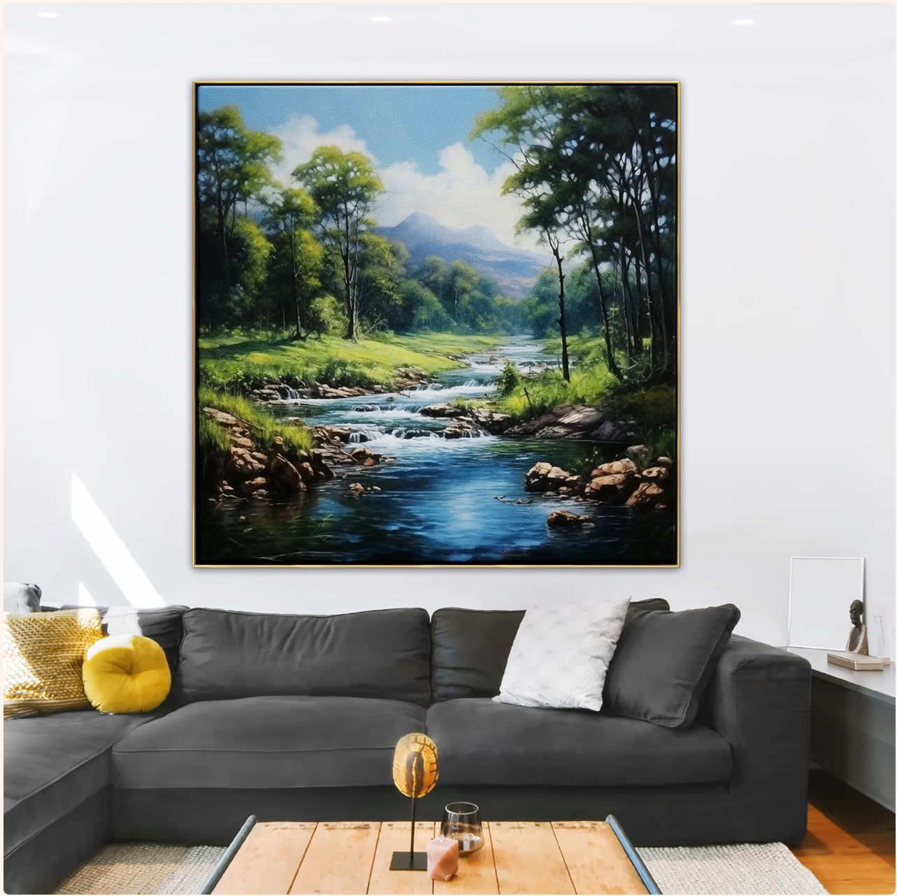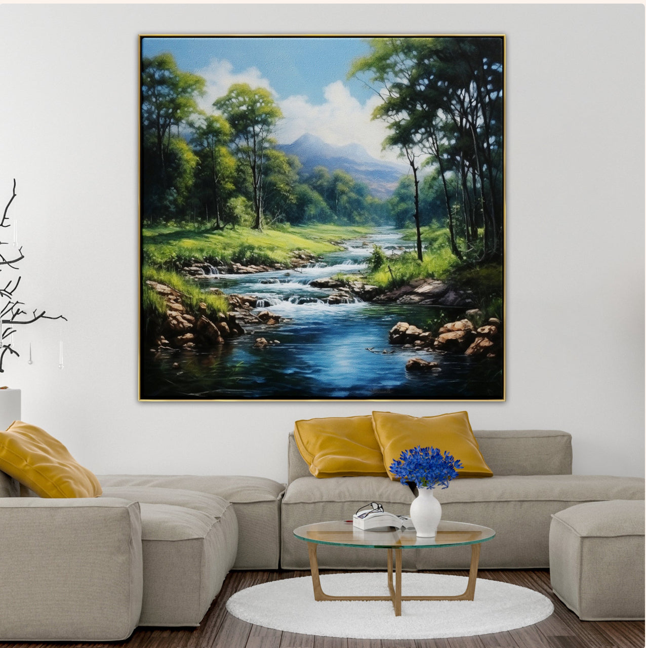 In 'Engelberg', the enchanting landscape captures the serene beauty of a lush valley. The river's gentle flow weaves through towering trees, offering a tranquil escape into nature's embrace for any space.