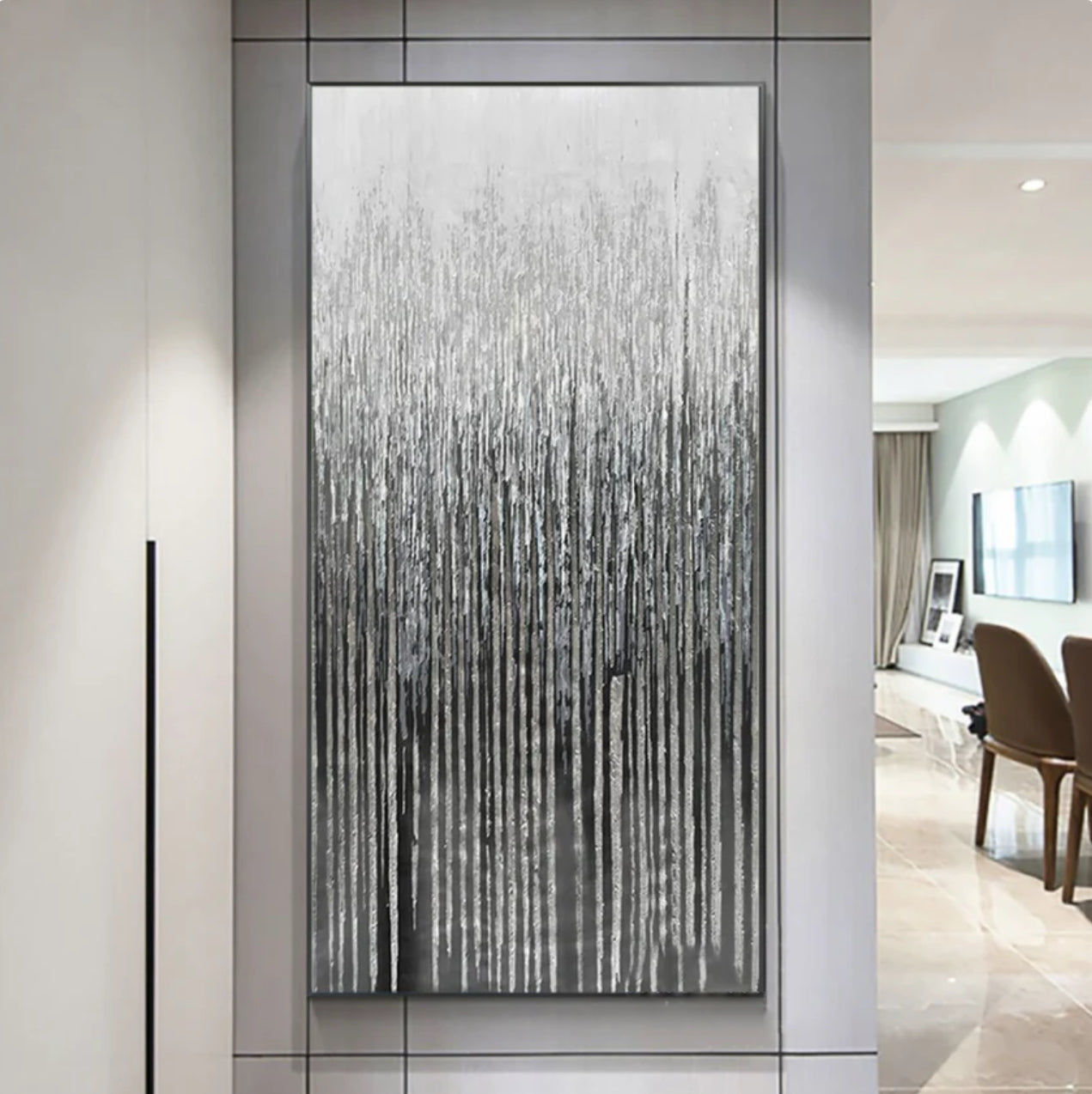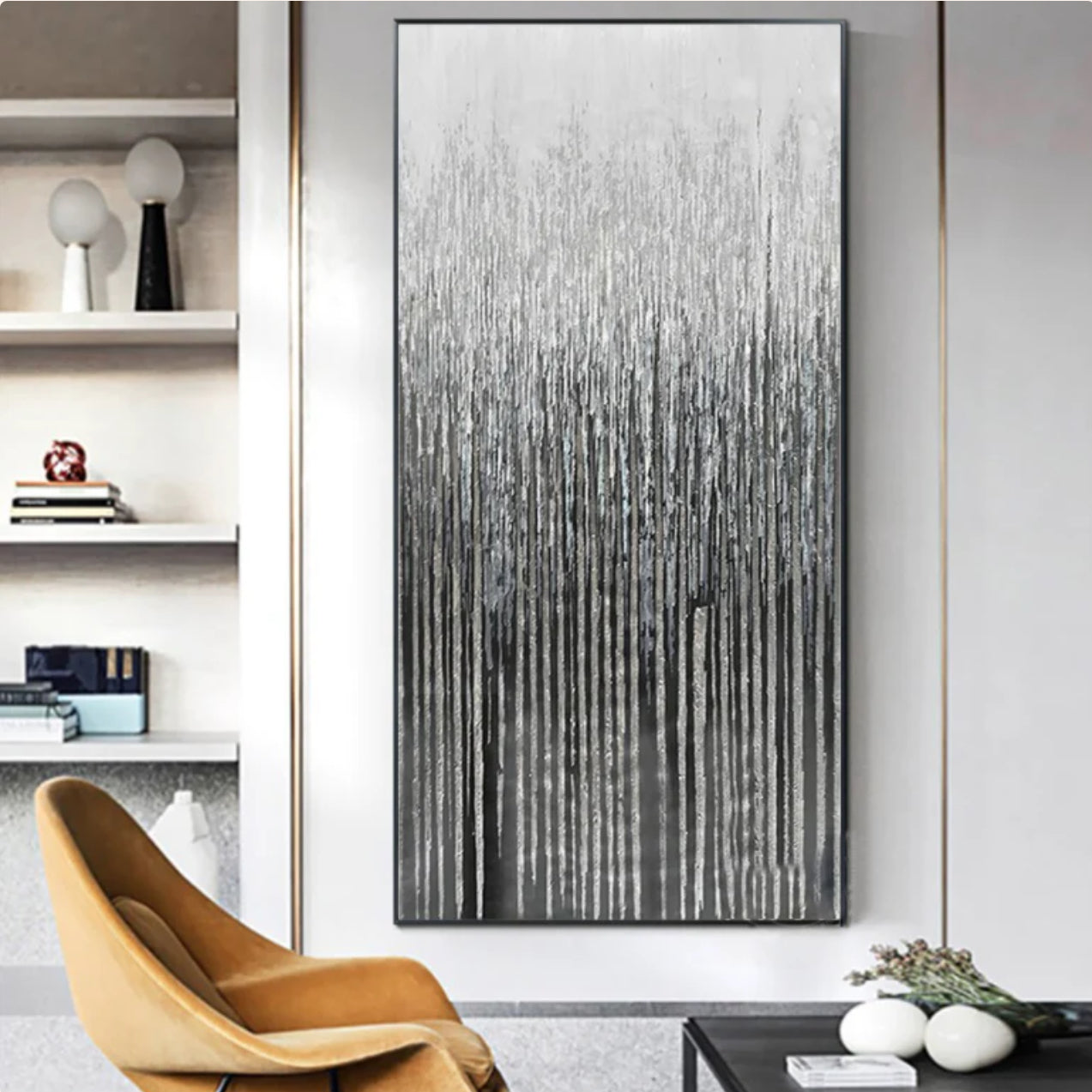 Pitch black, colossal trees towering over the ever-so-cold snowy skies. Their resilience to withstand the harsh winter conditions was the inspiration for the artist to create this cold, yet intriguing art piece.