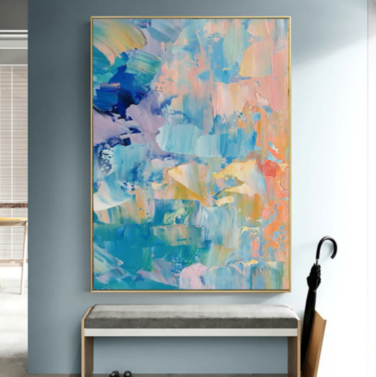 Bursting with beautiful, vivid colours, this abstract art piece sweeps you off your feet! Through the use of surprising and extraordinary colours, a rich and vibrant play of paint is created. Both soothing and captivating, this painting leaves its mark wherever it's hung.