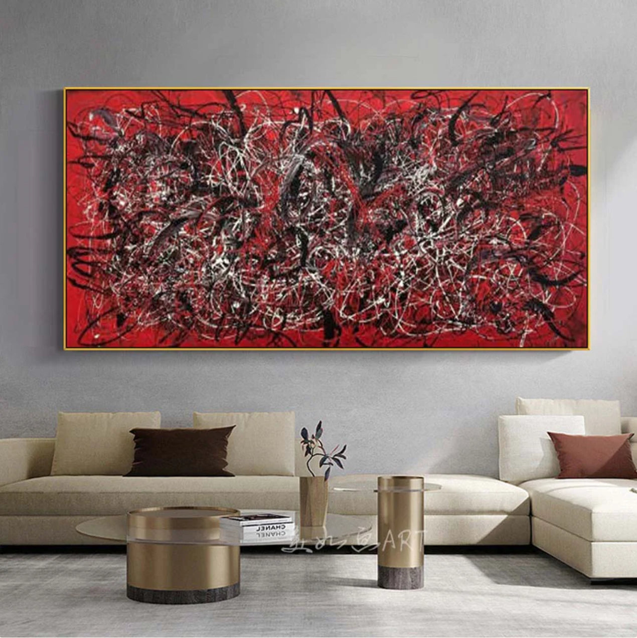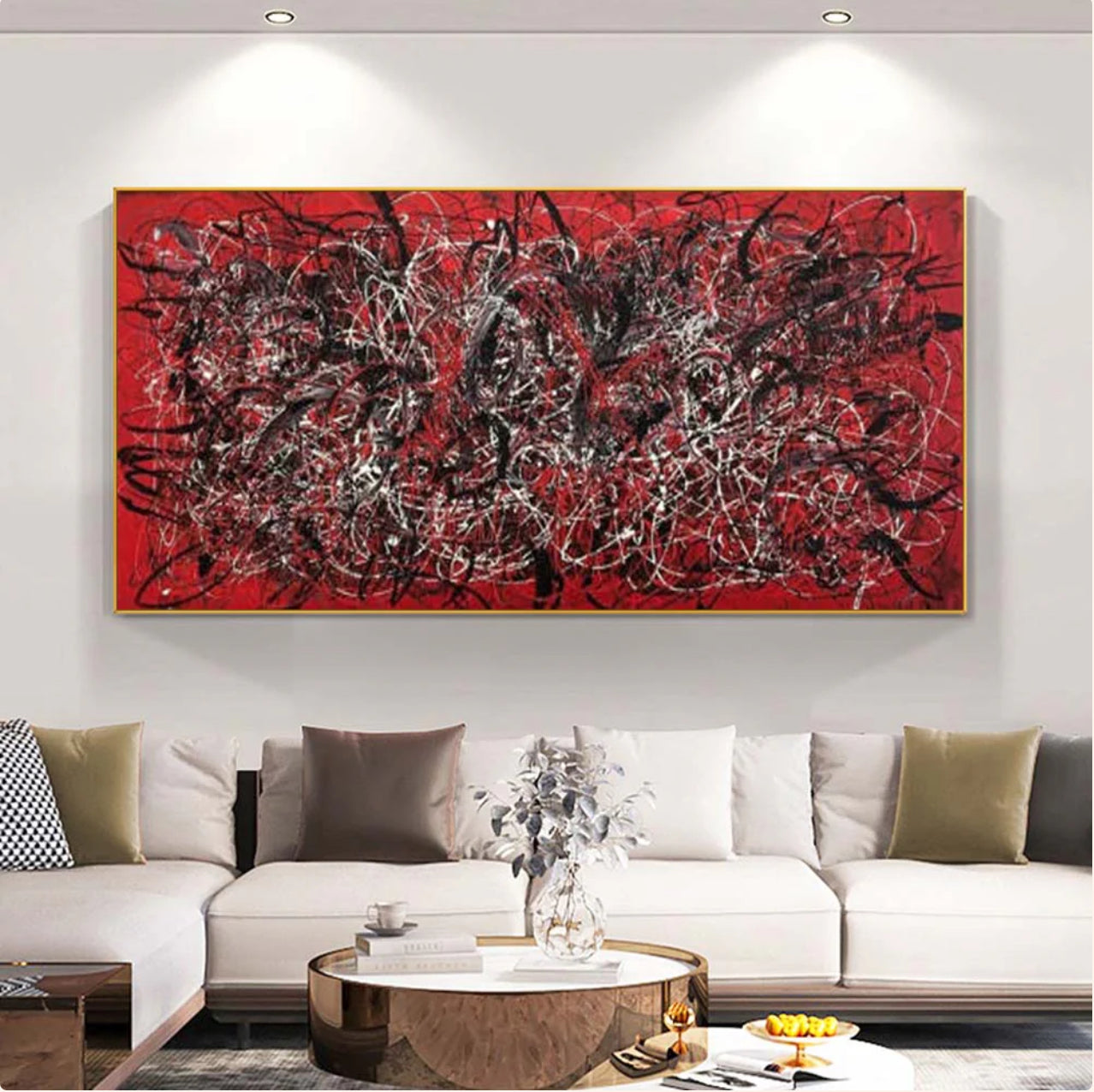 This mesmerizing artwork draws attention with its vibrant red backdrop. Dynamic black and white lines swirl and dance across the canvas, creating a captivating visual symphony that adds energy and intrigue to any space