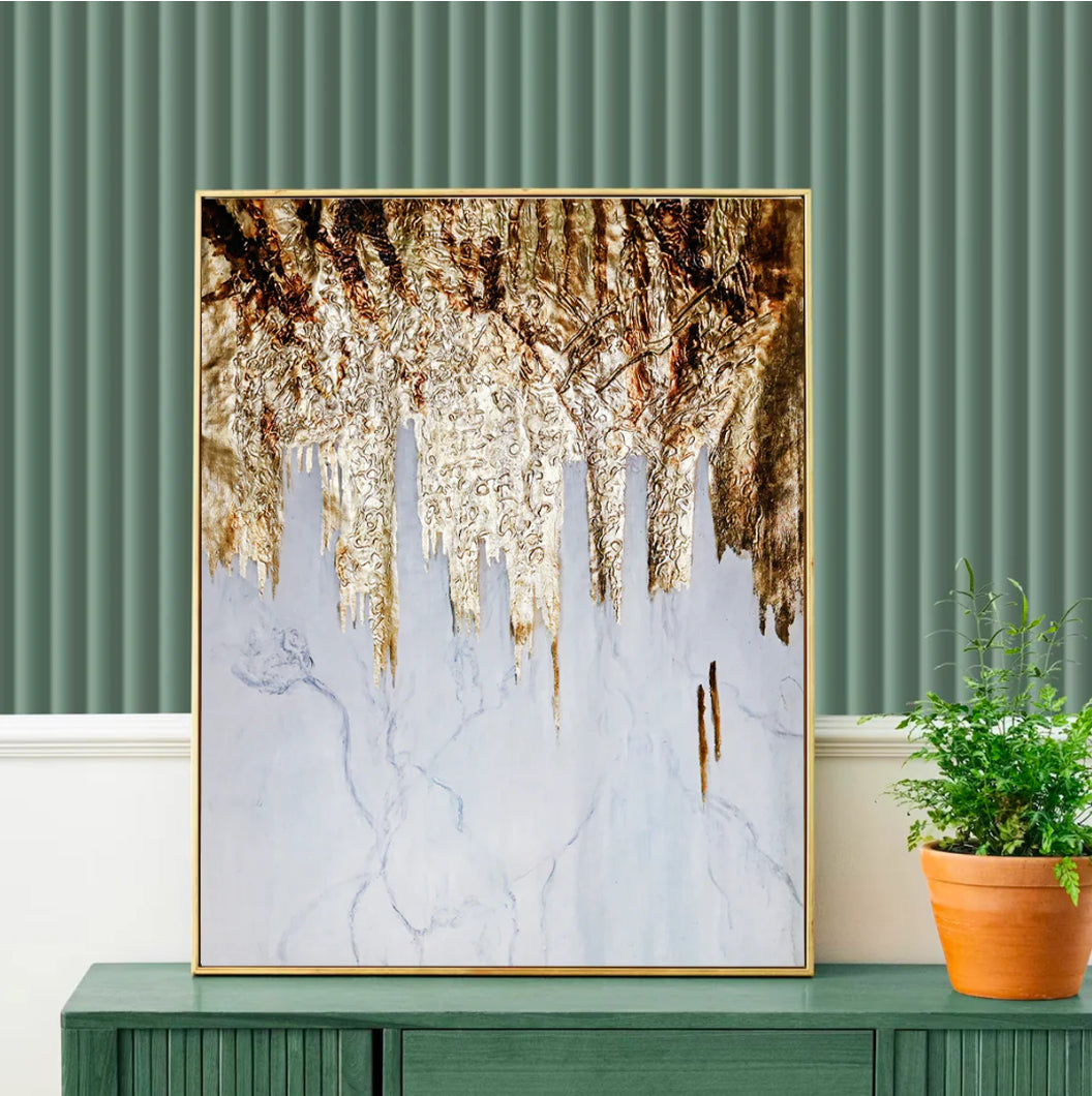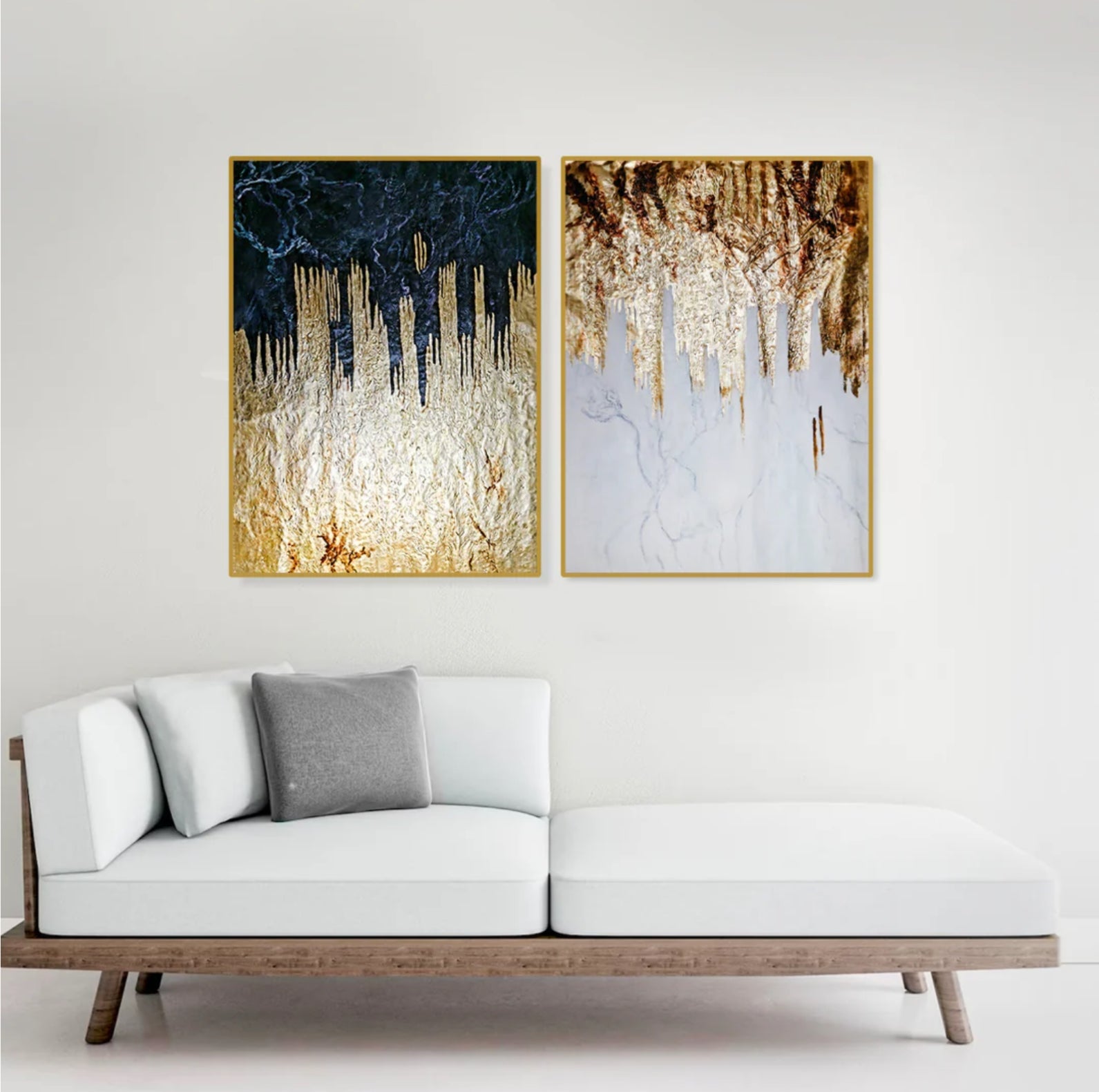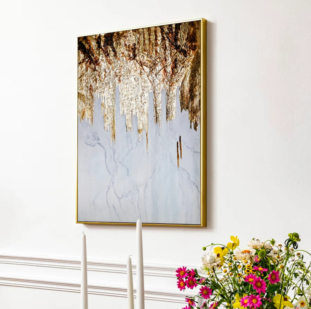This handmade painting, entitled 'Fusible', is crafted on canvas for a striking modern look. Its gold foil, white marble effect, and inspiration from melting metal create an artistic and visual appeal that will bring contemporary elegance to any décor.
