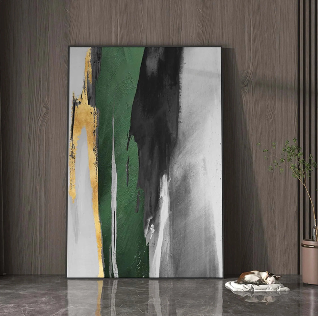 Immerse yourself in the dynamic beauty of this abstract painting. Bold strokes of green, black, and gold create a striking composition that brings a sense of modern elegance to any room