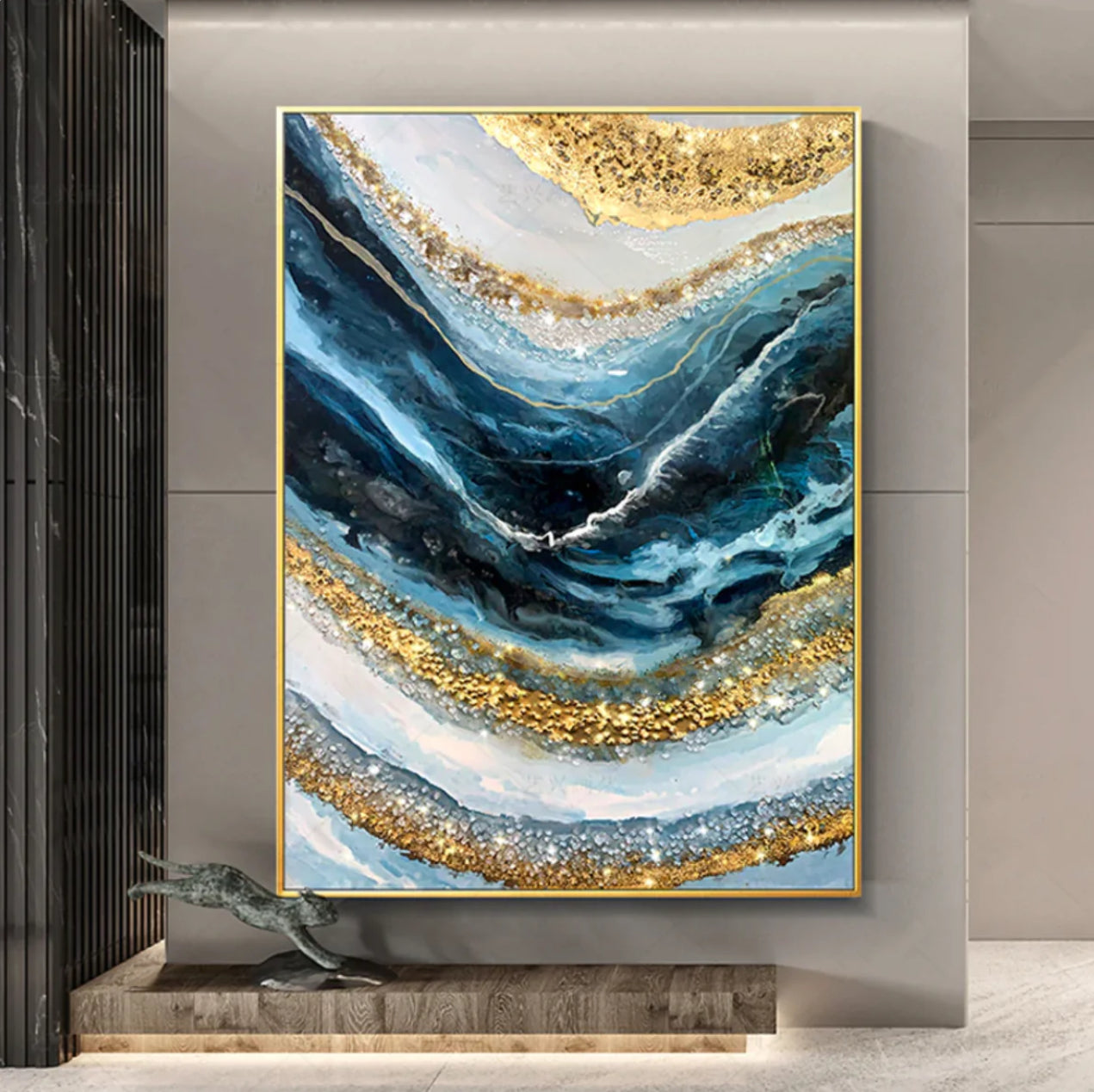 What a magnificent piece it is! The astonishingly realistic wave crashes majestically on the sparkling golden coast. Through the use of multiple horizontal layers and different convincing shades of blue, this painting also has a lot of depth.