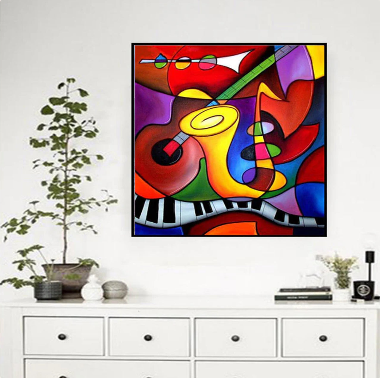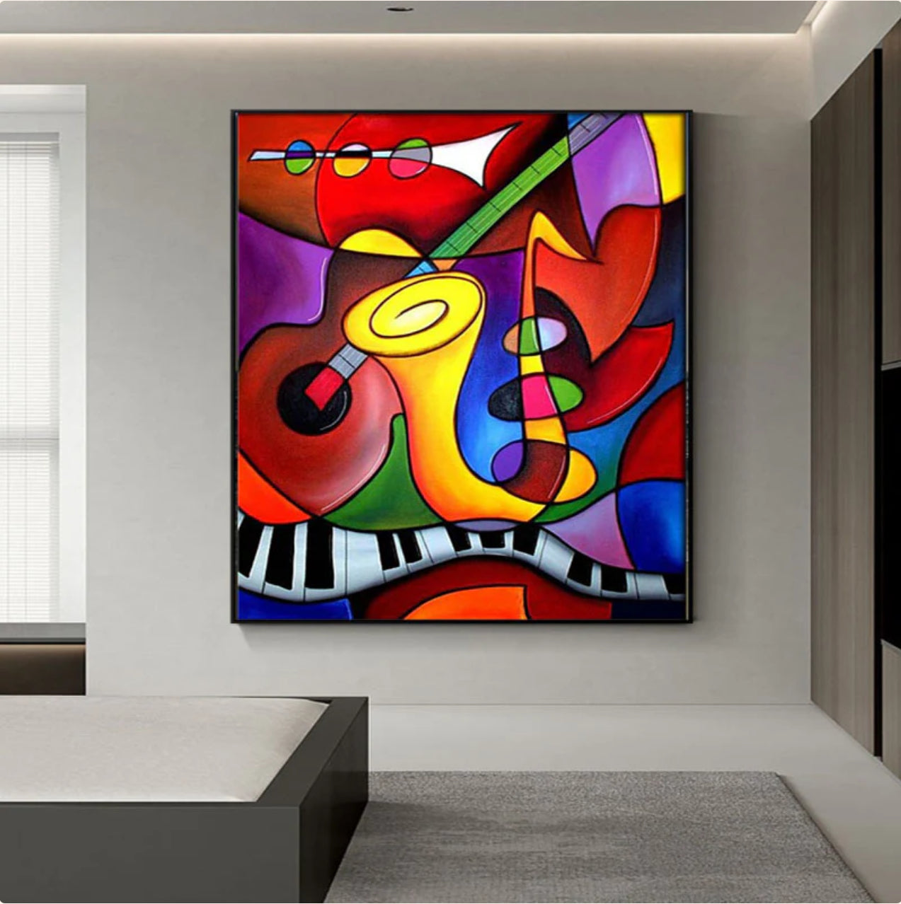 Feel the rhythm in this lively artwork, where bold colors and musical elements blend harmoniously. It's a perfect piece to brighten up your space with its energetic vibe.