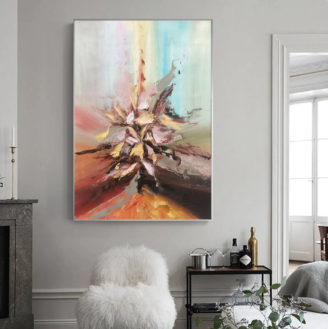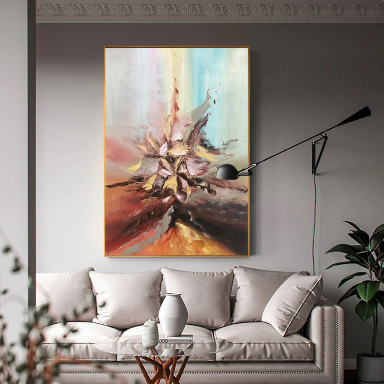 Like a true implosion of art, this painting comes at you with its dynamic composition, unique color palette, and stunning details! There is so much to see with this painting, that it'll draw your attention, time after time!