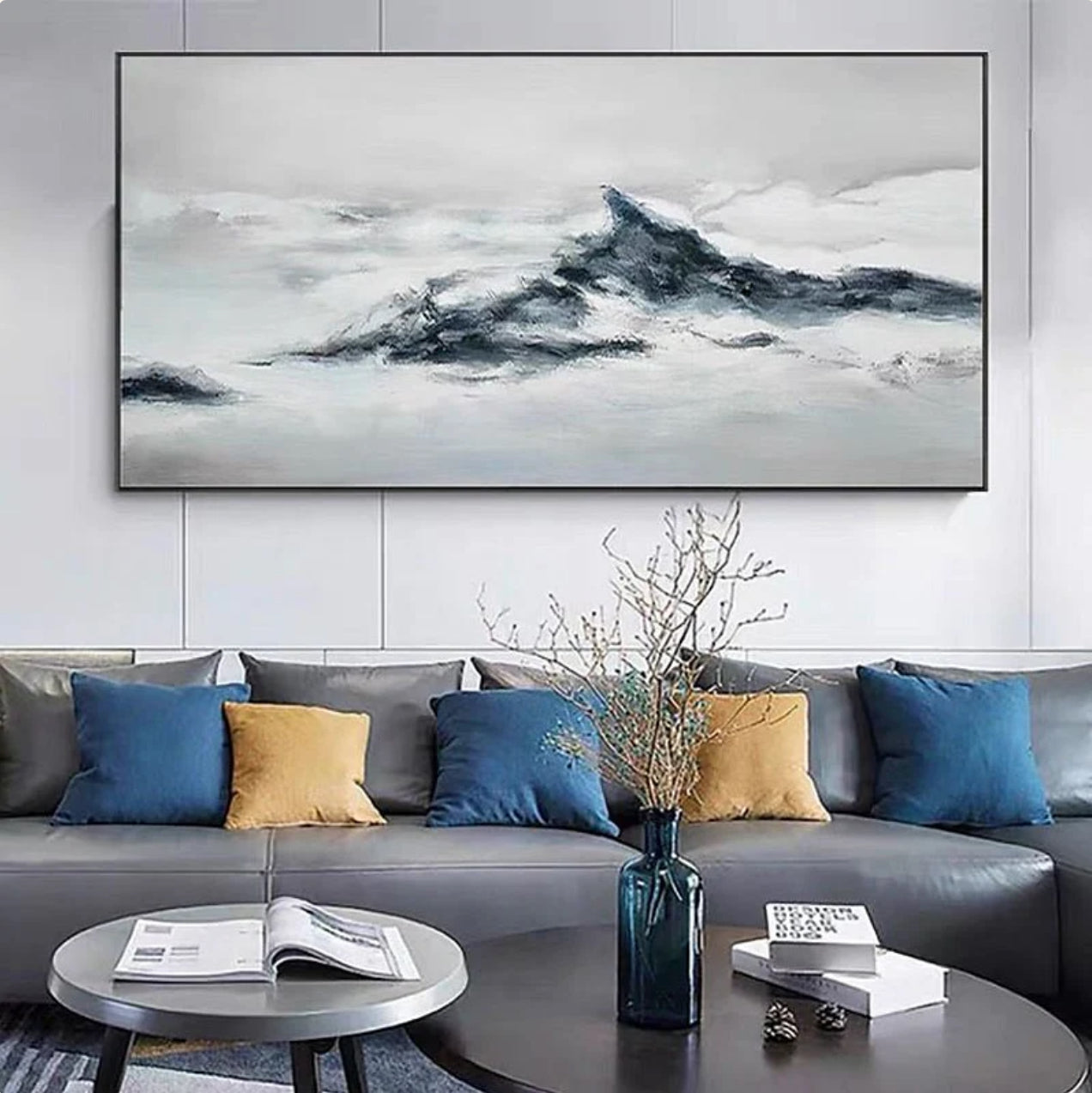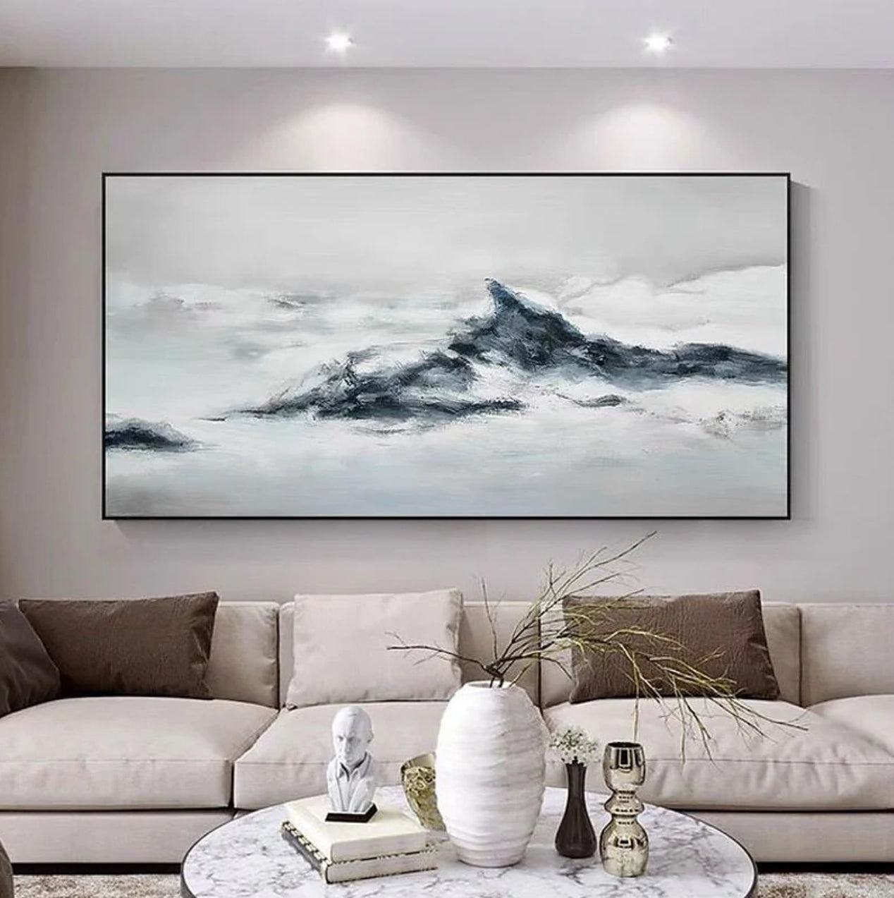 We are floating on cloud nine with the beauty of this artwork! 'In the Clouds' is a modern, impressionistic artwork that displays mighty mountains towering above a soft blanket of clouds. With beautiful contrasts, you can get lost in this piece for hours!