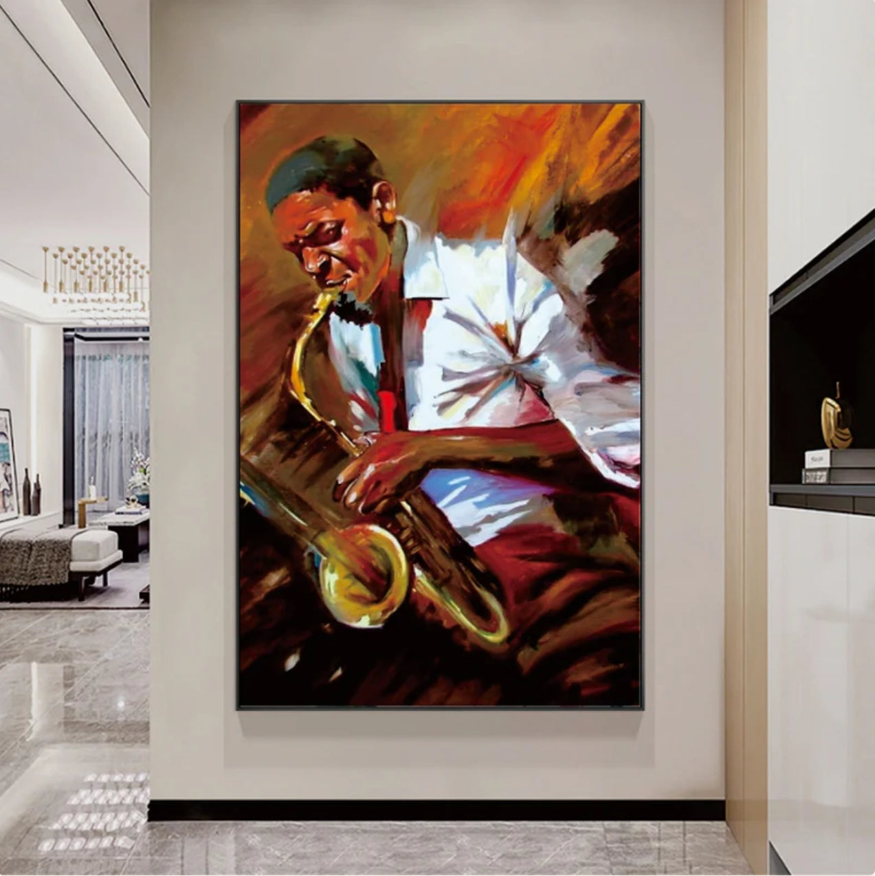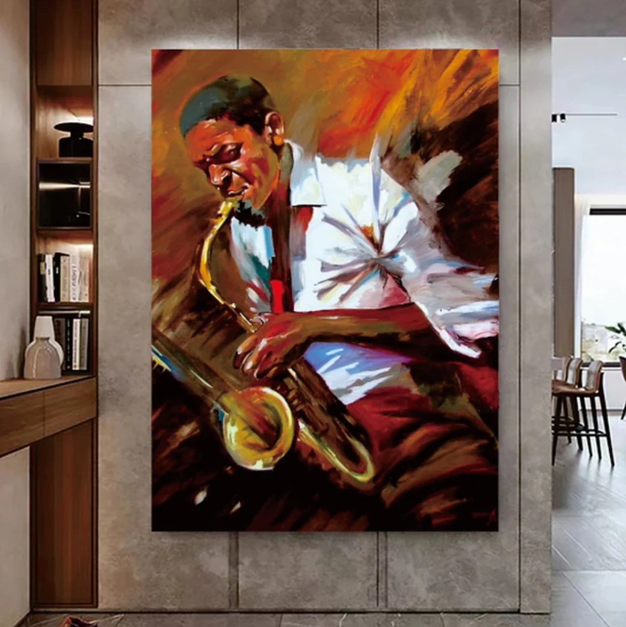Feel the music come alive in "In the Zone." The painting beautifully captures a man lost in the soulful embrace of his saxophone, each note echoing his passion. It's a captivating visual symphony that truly embodies the essence of musical immersion.