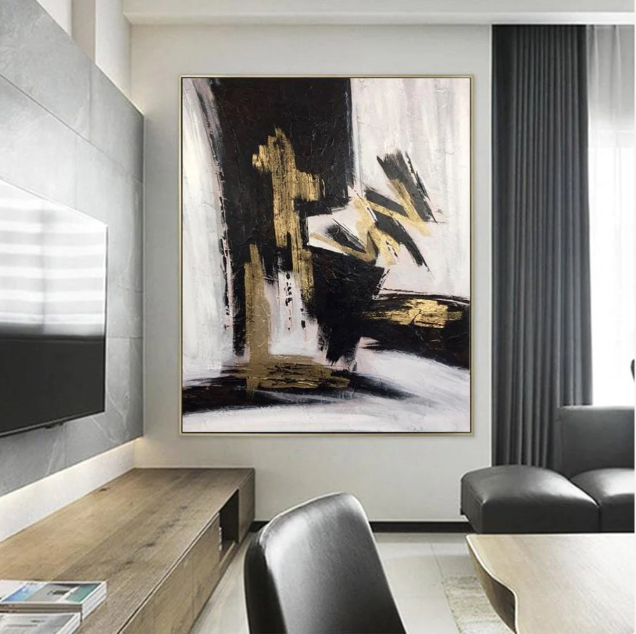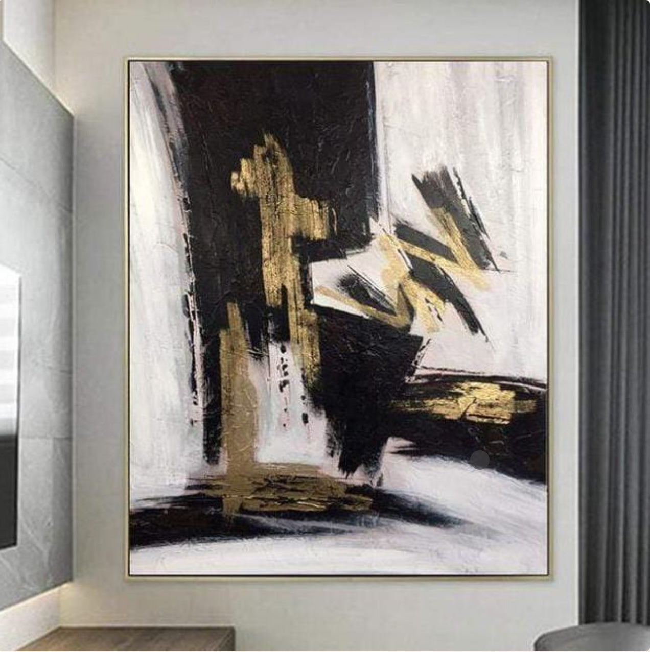 Unlock the secrets of desire with "Infatuation," an abstract masterpiece where bold strokes of black, white, and gold collide in a symphony of emotions. Each brushstroke tells a story of longing and obsession, drawing you deeper into the canvas.