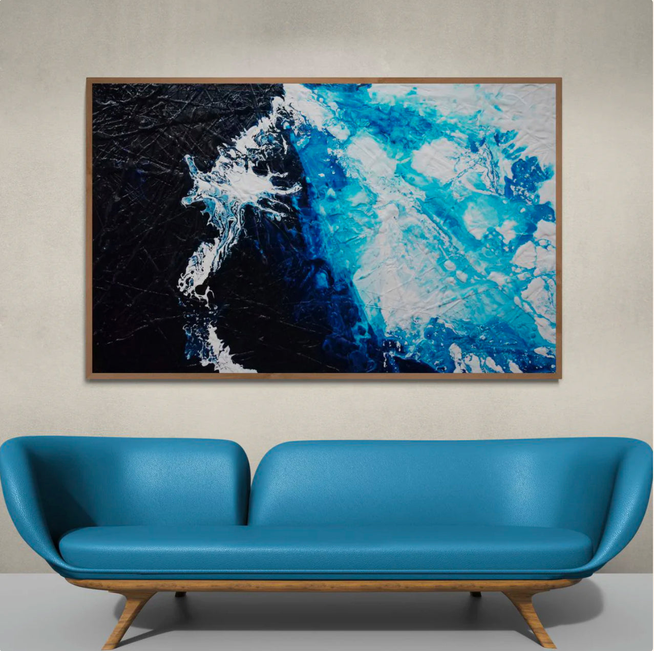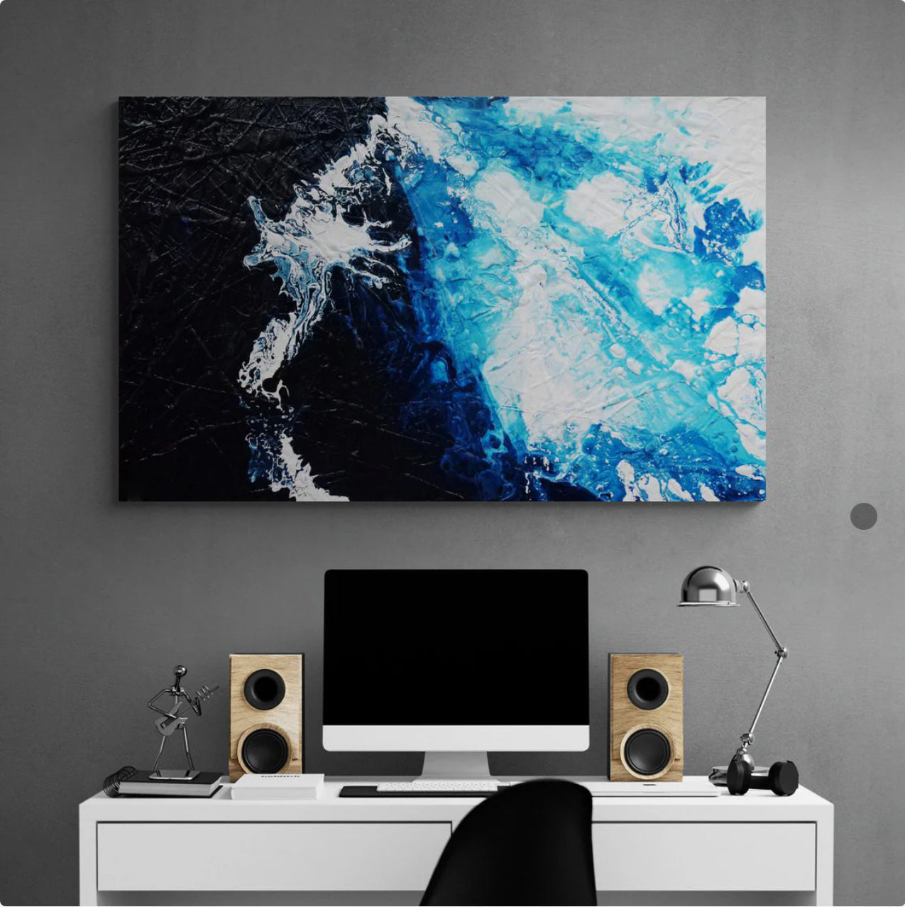 Jökull, Icelandic for glacier, is a breathtaking tribute to Iceland’s frozen beauty. This painting captures the raw power and delicate elegance of ice, blending deep blues and icy whites into a stunning masterpiece.