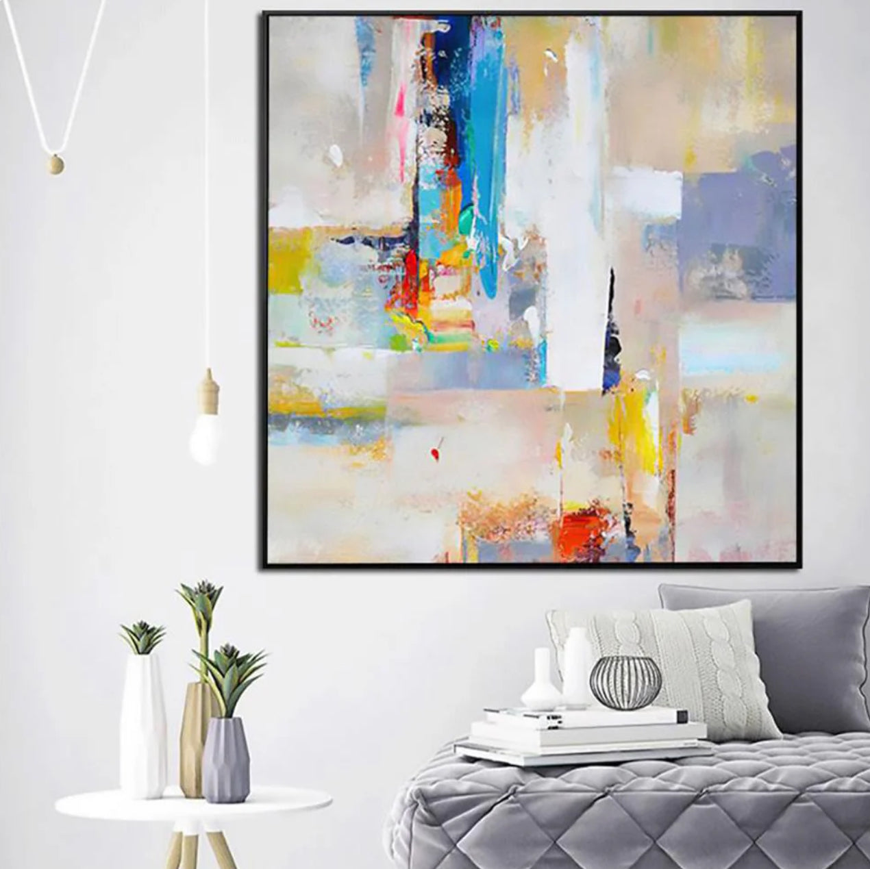 Translated from French, this abstract art piece is named: 'The Past'. Sometimes we wish we could change our past, but we also have to appreciate the good things. This modern piece expresses this feeling beautifully. With many vibrant colors, the future looks bright!