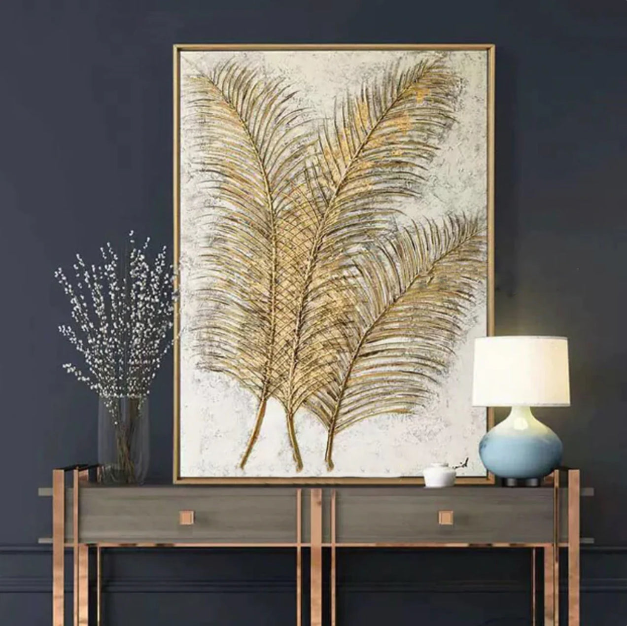 This stunning painting portrays 3 dried, gold leaves in a beautifully realistic style. The attention to details and contrast with the white background makes these leaves really pop out of their canvas.
