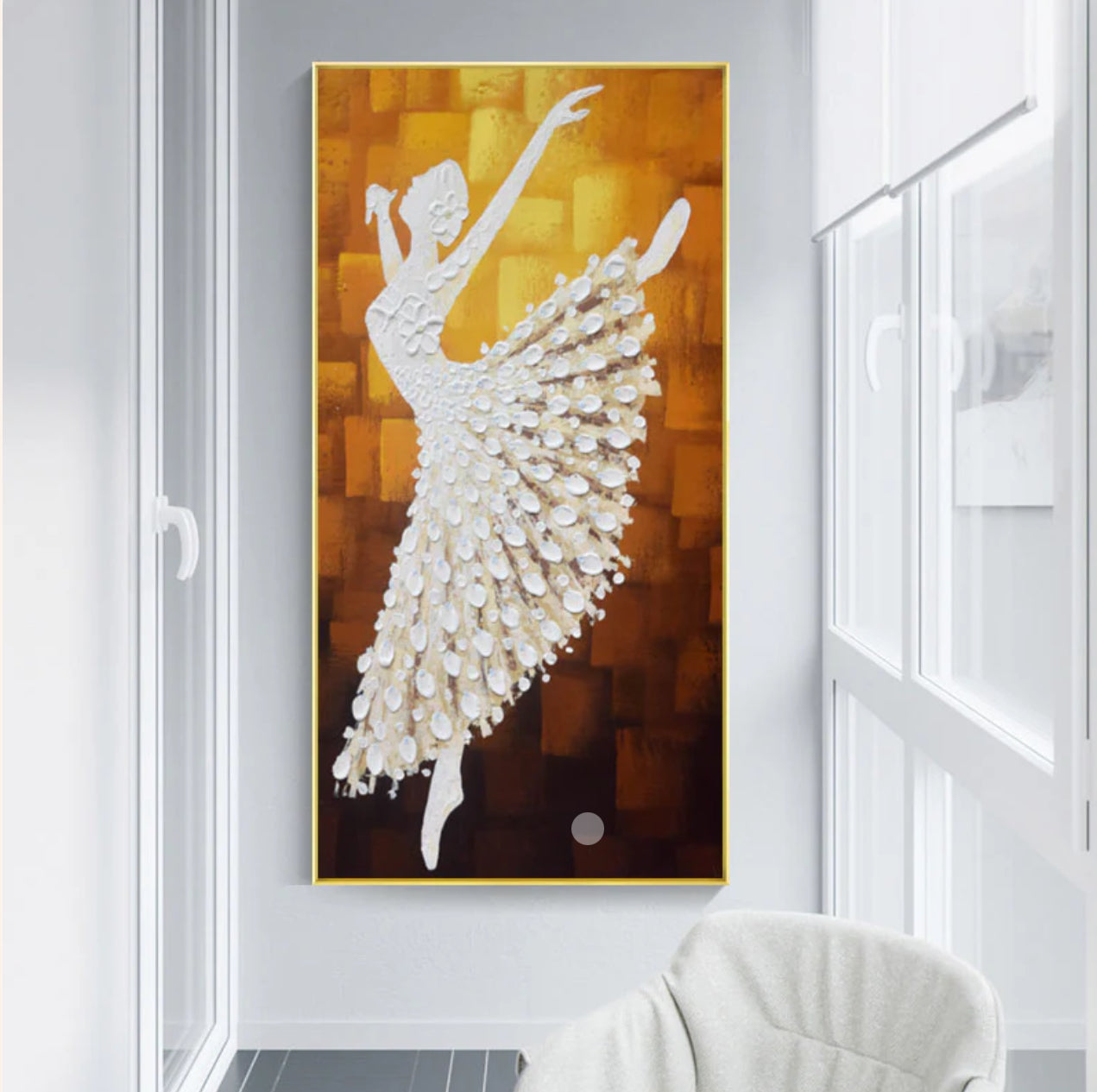 The painting depicts a ballerina dancing in front of a gold-brown background. The bold colors and beautiful brushstrokes make it one of the most beautiful pieces we've ever seen. It will give any room look a tasteful ambiance! Just stunning!