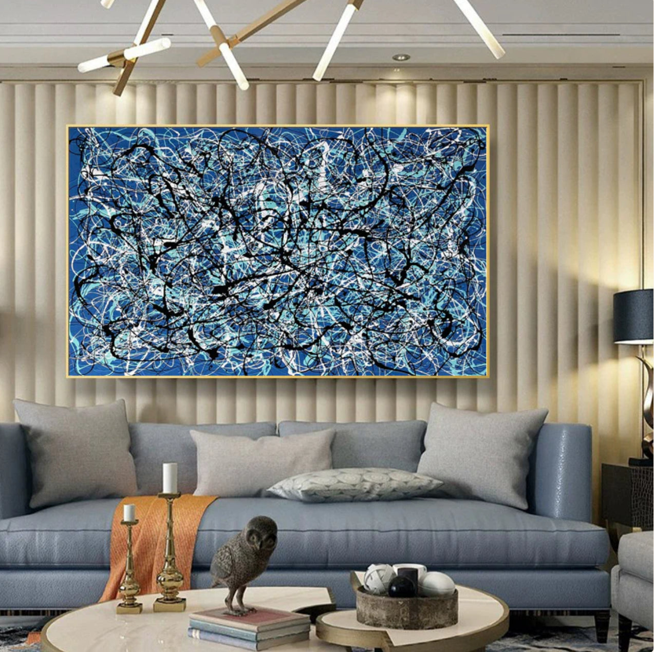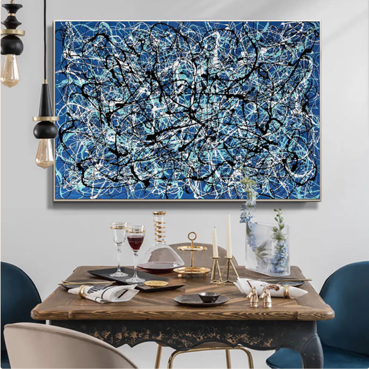 Within the captivating canvas of 'Lost', a beautiful blue background embraces a unique choreography. Vivid white and black lines dance along the dynamic composition, evoking a sense of wonder, as if walking through the labyrinth of the unknown.