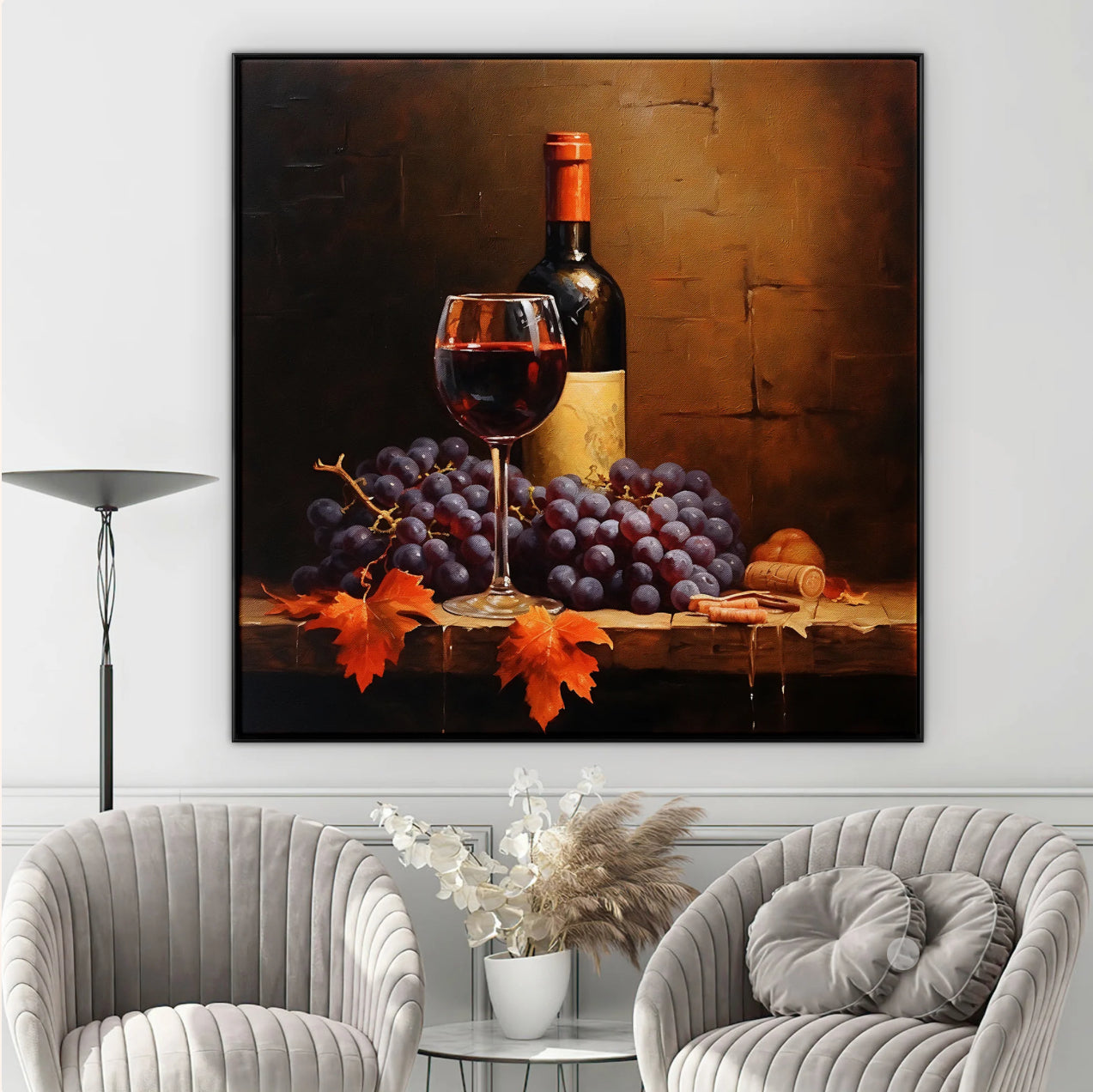 In "Merlot," realism breathes life into the still life of wine, grapes, and autumn leaves. It's a rich elixir of colors and textures, capturing the essence of a vibrant fall day and paying hommage to a beautuiful wine.