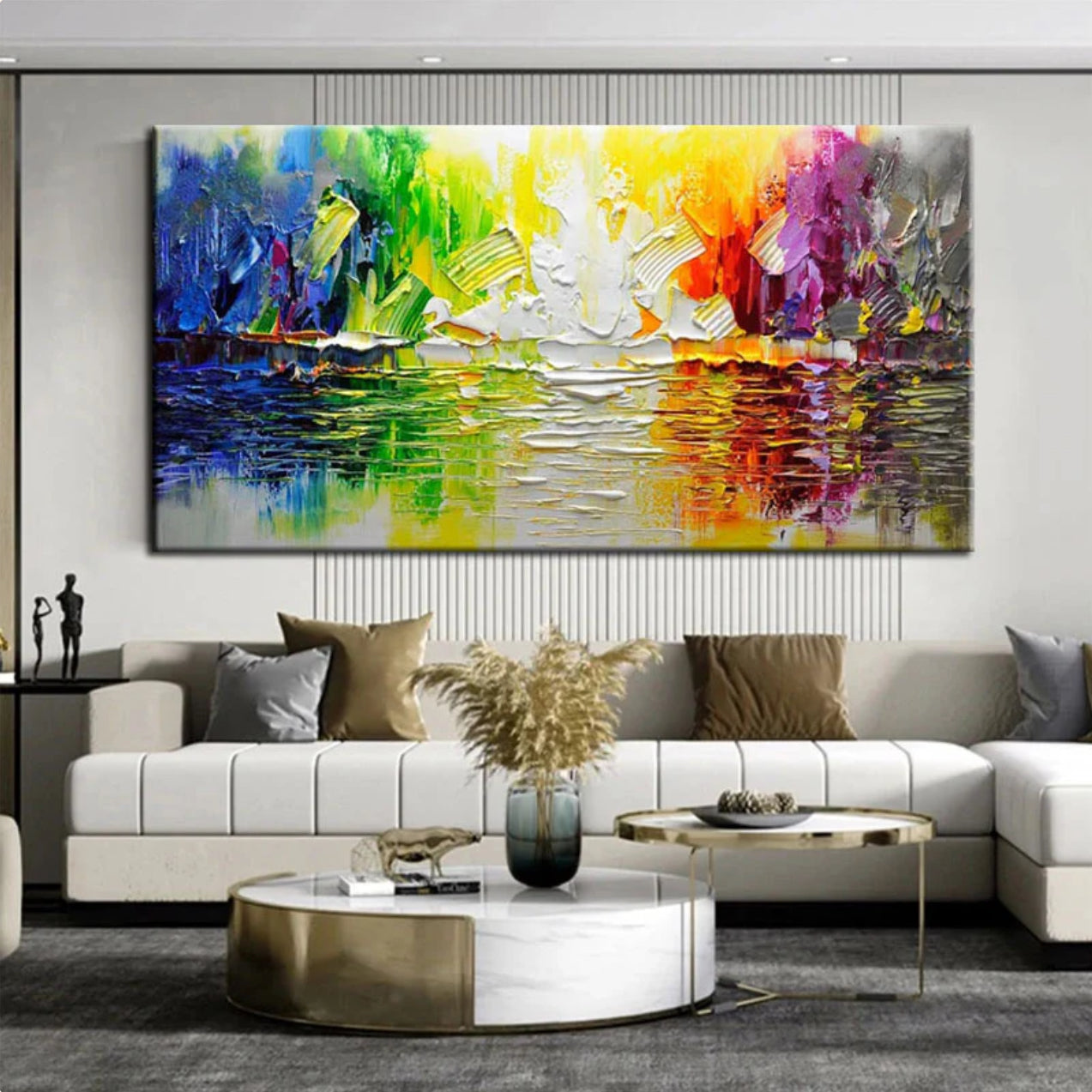 This beautiful painting captures the essence of a journey towards peace and wisdom. The vibrant colors and reflective water create a captivating scene, perfect for adding a touch of colorful serenity to your space.