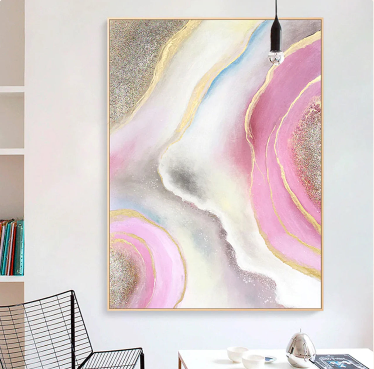 Where lava usually is destructive and ferocious, this pink painting shows a majestic, radiant kind of lava. The beautiful pink and gold shades are mixed in perfectly with the galaxy-coloured background to create a dazzling stream of elegance.