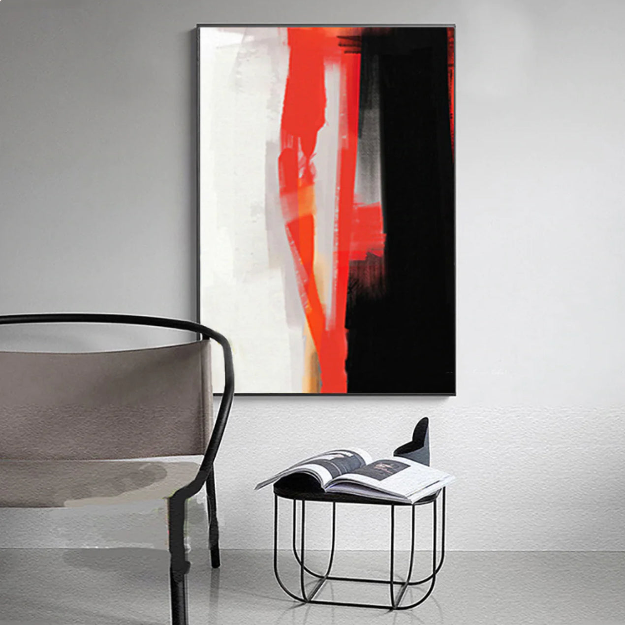 There are no beautiful surfaces, without a terrible depth'. This handmade abstract art piece Red Haze tells the story of pearl white and charcoal black, two opposing forces, separated by two relentless red strokes. Which simultaneously act as a bridge and as a border between dark and light.