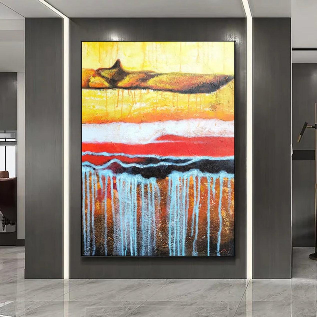With a dynamic composition and a unique color palette, this is a special piece! This abstract painting displays the different layers of the earth beautifully. And thanks to a special technique, the paint feels as if it is dripping from the canvas!