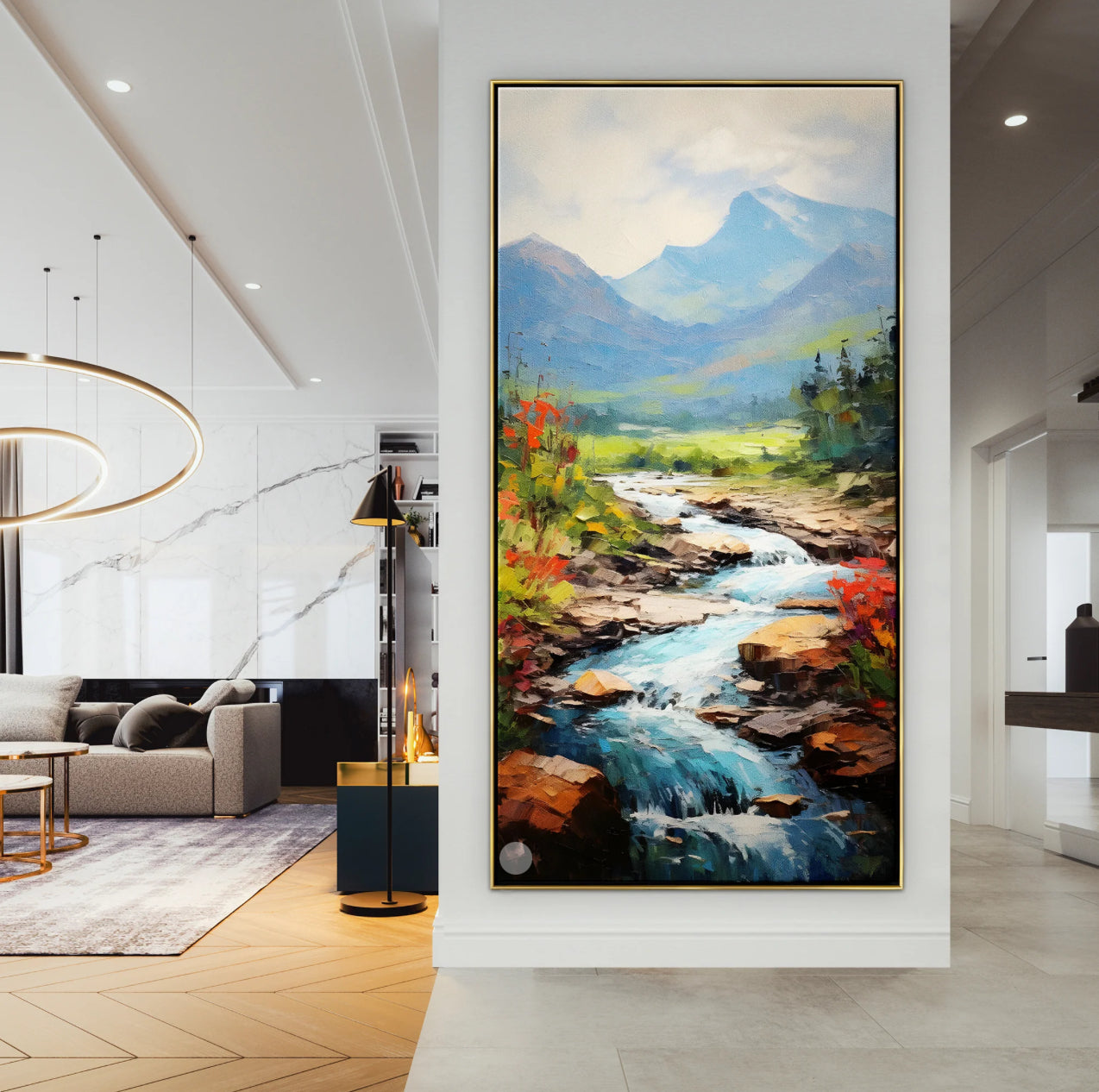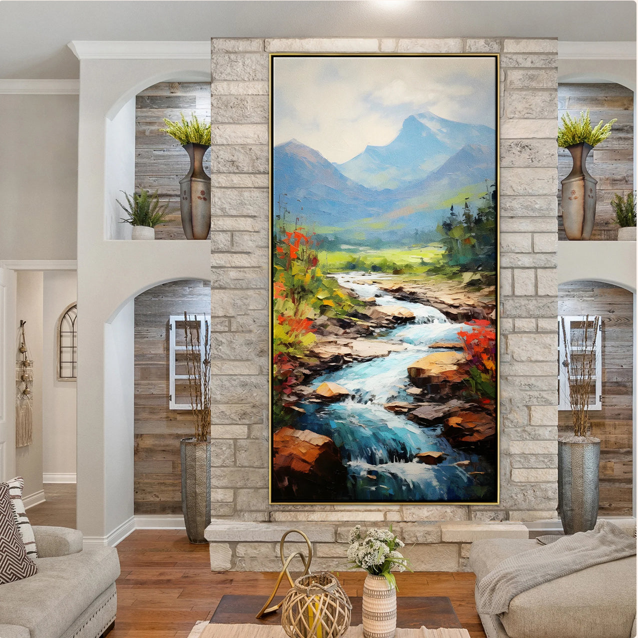 As the river gently winds its way toward the mountains, it's as though you can hear the flow of cold water. This artwork brings the soothing sound of nature into your space with a warm and cozy painting style.