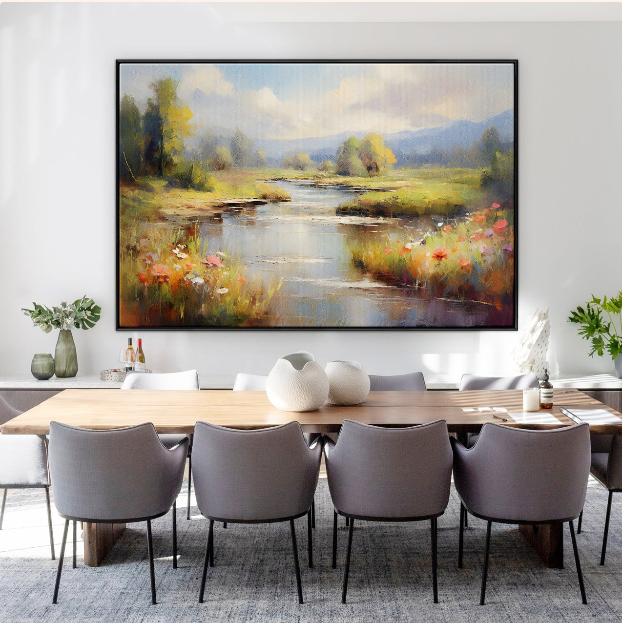 Discover the harmony of the hills as they meet the meandering river. This artwork gently leads you into the calmness of the hills, where the river's story unfolds with every brushstroke.