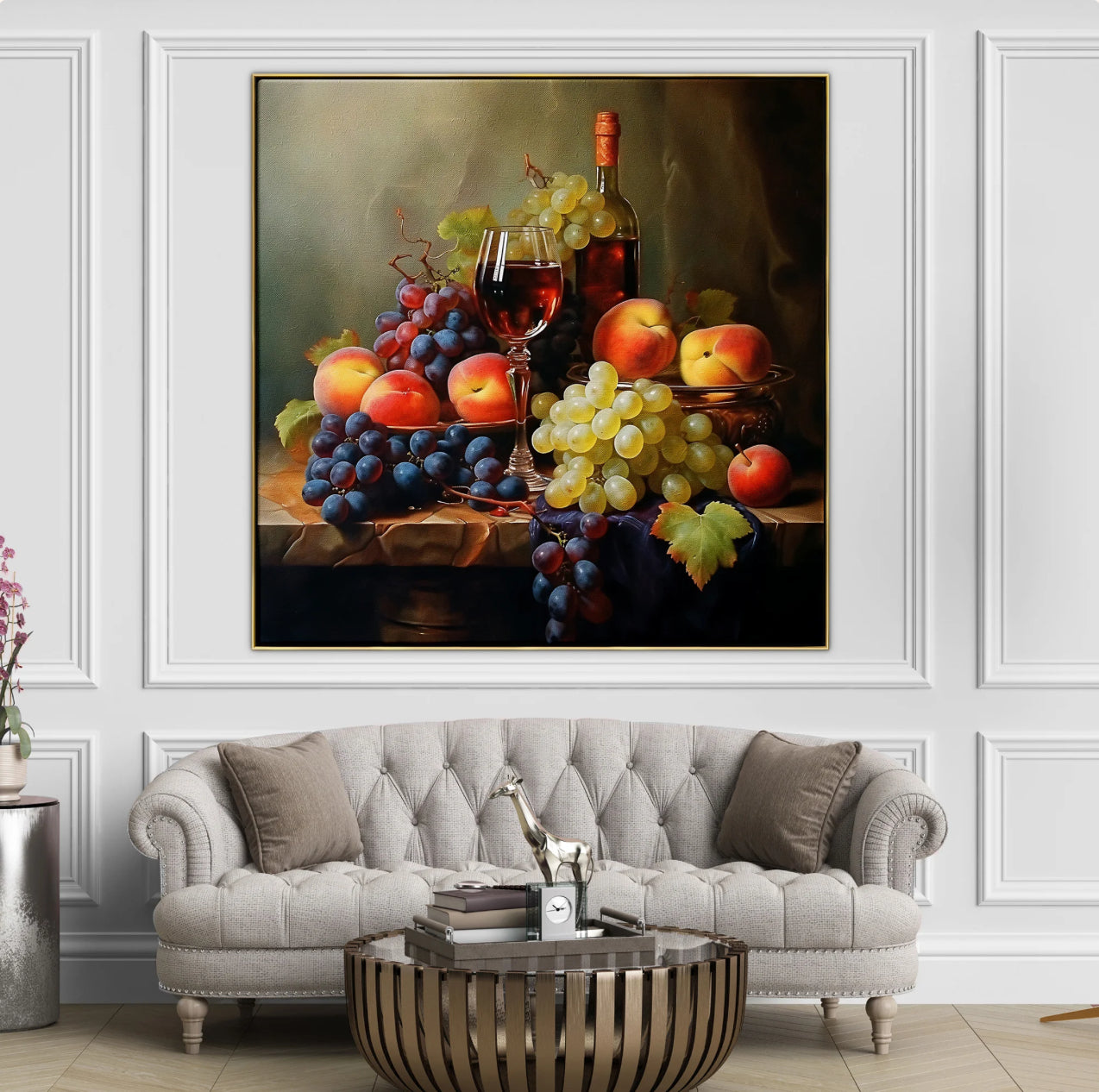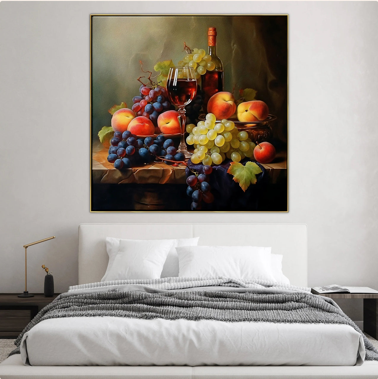 Shades of red come alive in this still life piece, where the velvety notes of Shiraz meet the lush textures of fruits. The stunning realism-style makes this piece a great addition to any home interior.