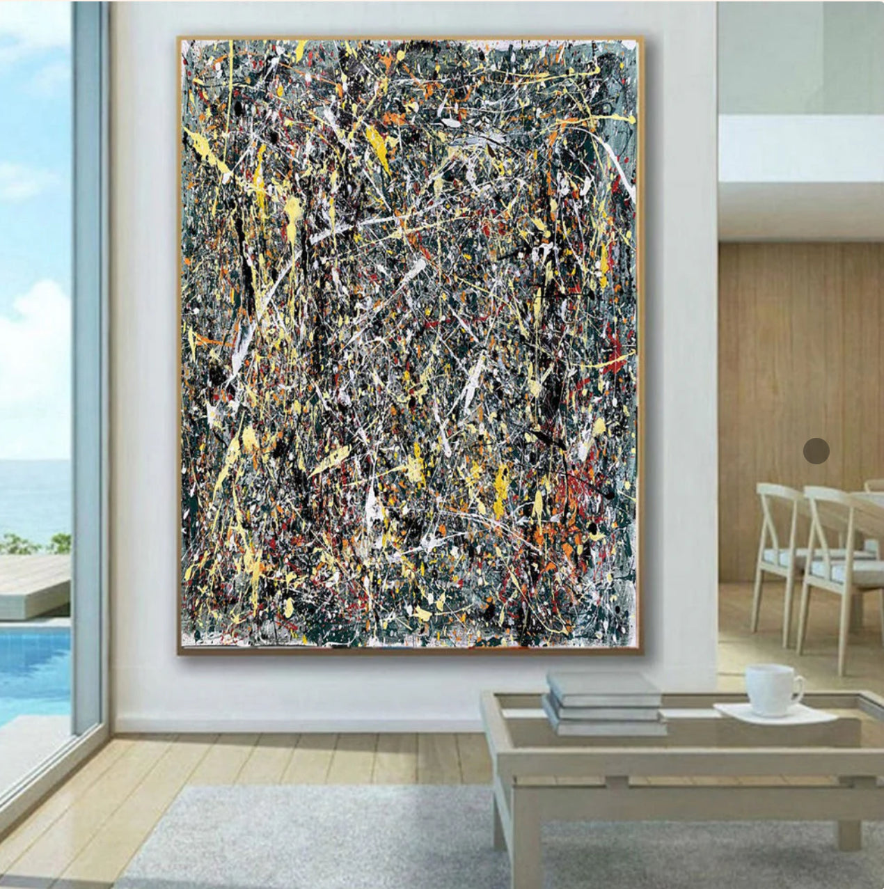 Pollock's inspired 'Solemn' captures the quiet energy of reflection through its intricate web of colors and movement. This painting balances bold strokes with deep thought, making it a striking yet meditative addition to your space.