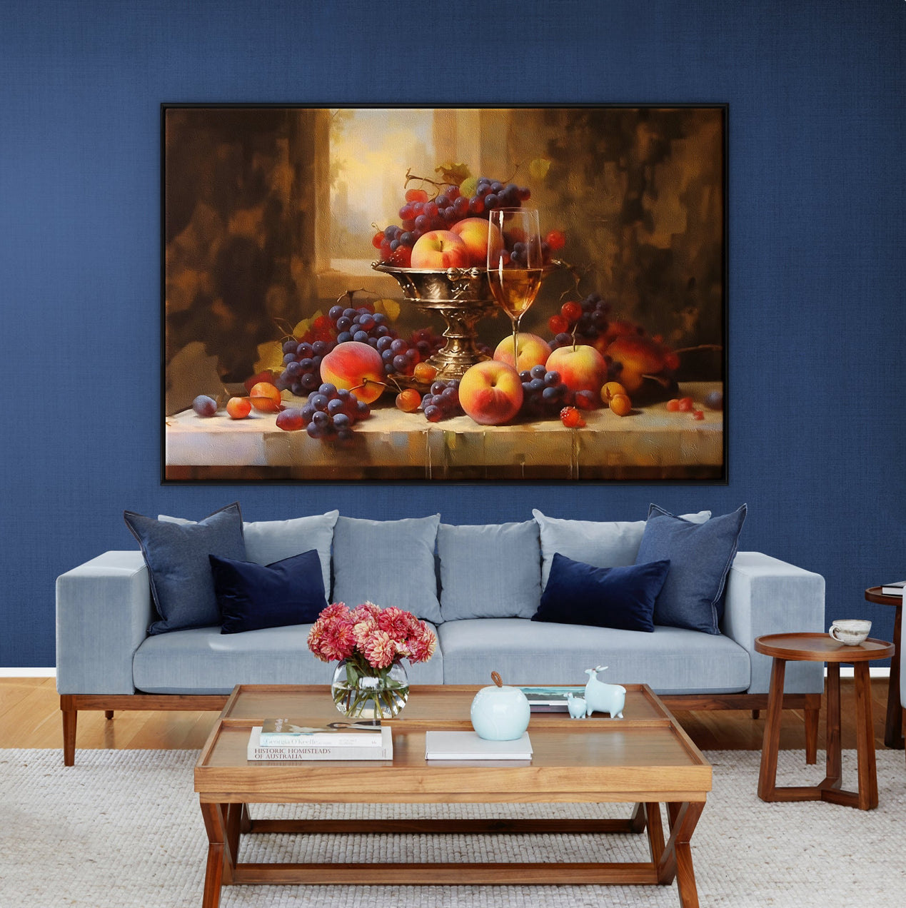 Experience elegance through this exquisite still life. The fruits seem almost edible in their lifelike presentation, making it a feast for the eyes. The stunning realism-style makes this painting a rich and sophisticated addition to any space or room.