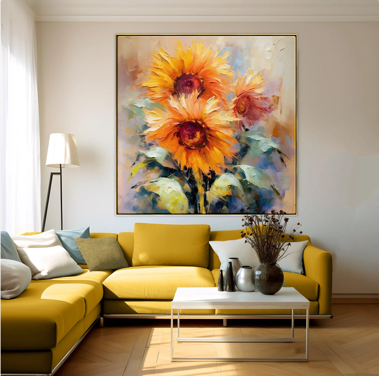 Brighten your days with this vibrant painting of sun-kissed sunflowers! The vivid colors and amazing texture really makes these flowers pop, creating a warm and welcoming atmosphere anywhere.