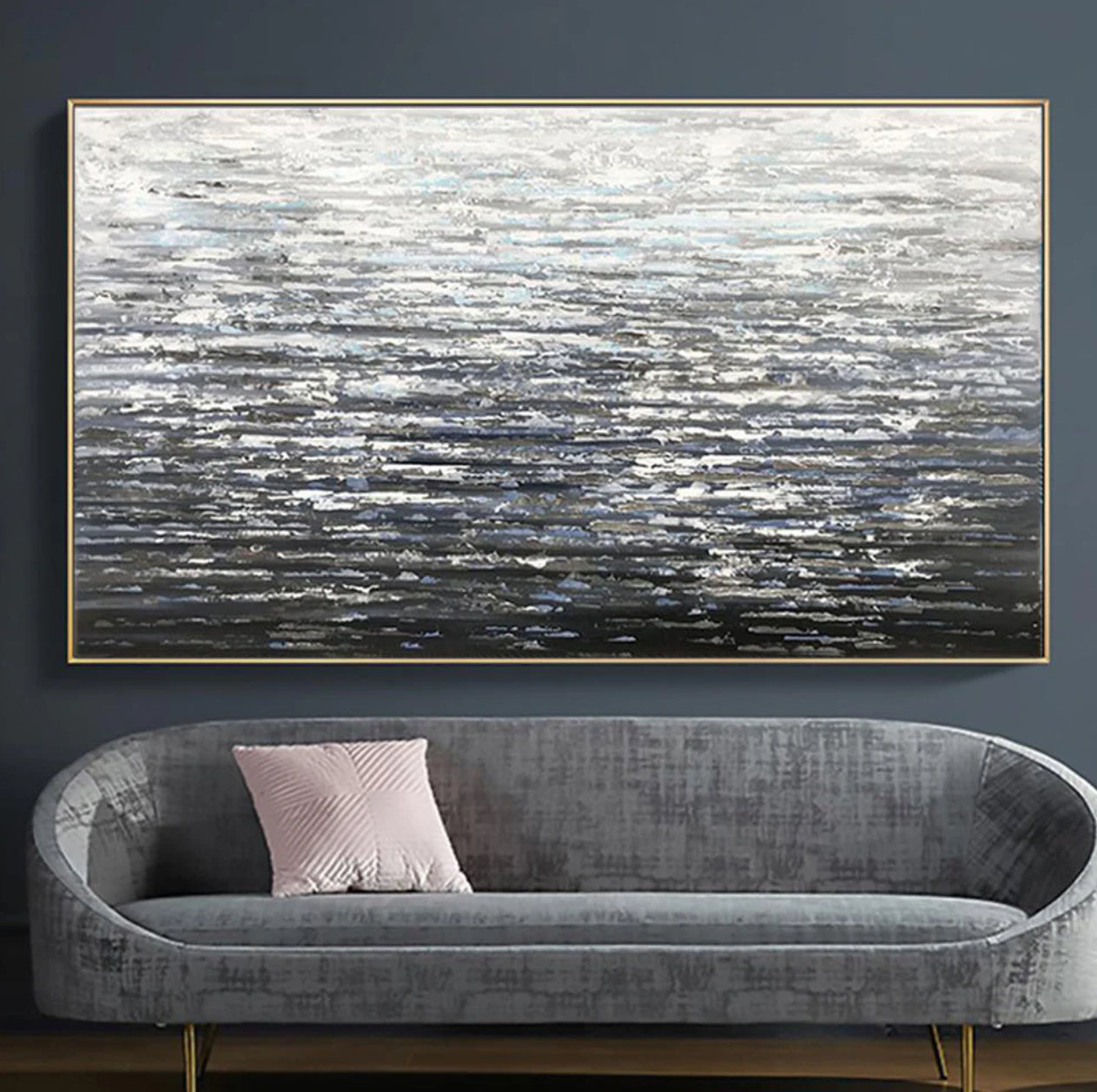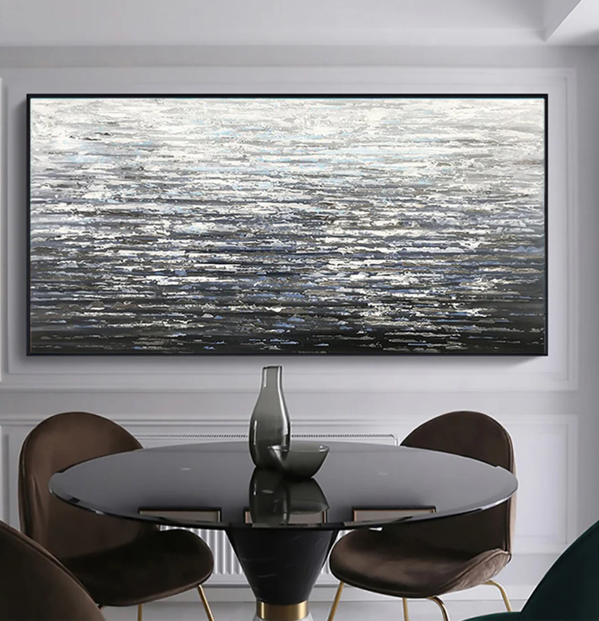 This beautiful large artwork portrays stunning grey horizontal lines. Together, they create a glowing wave of contrast, like a shining surface. With the use of primarily subtle colors, this unique art piece will suit any type of home interior!