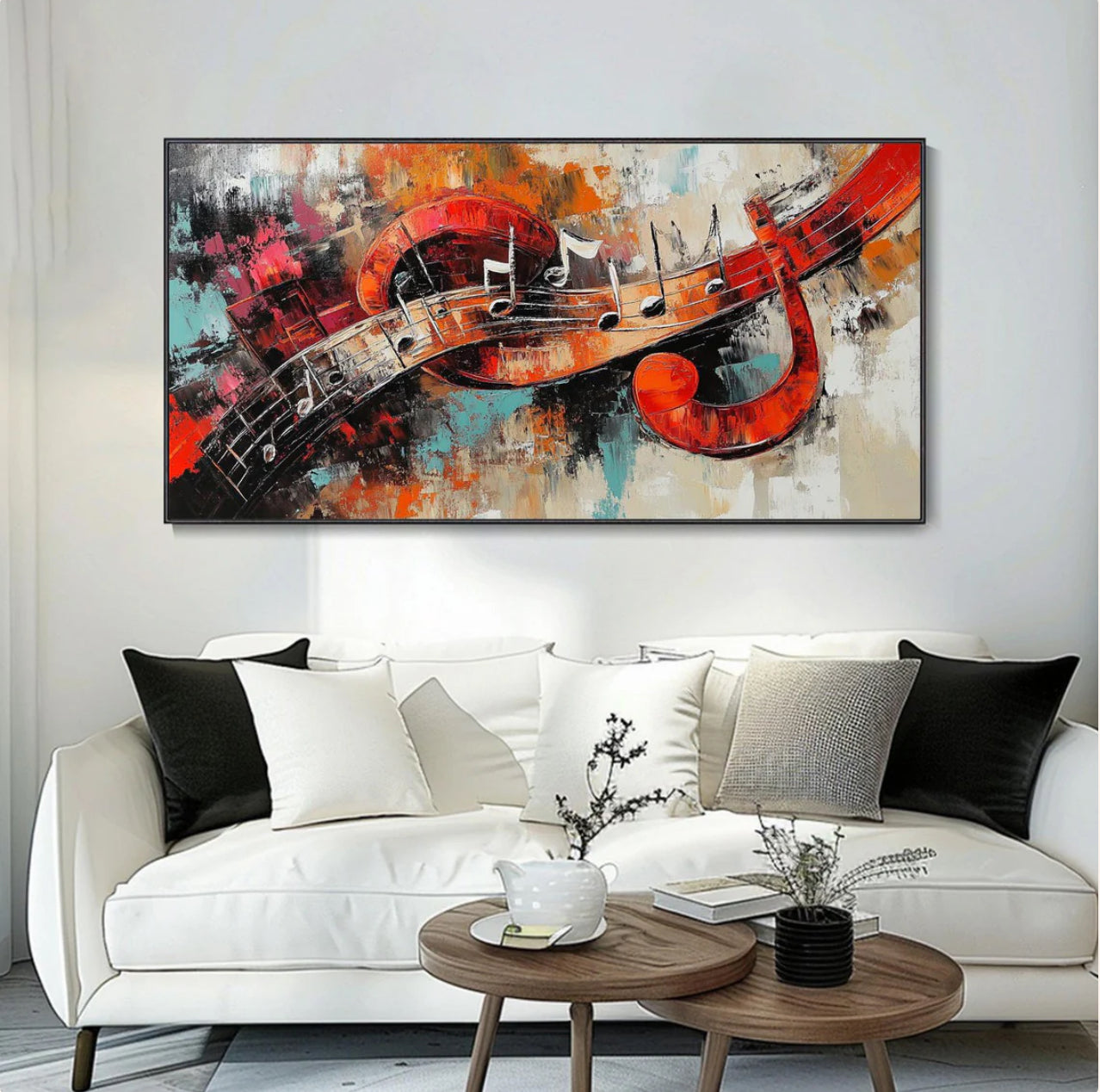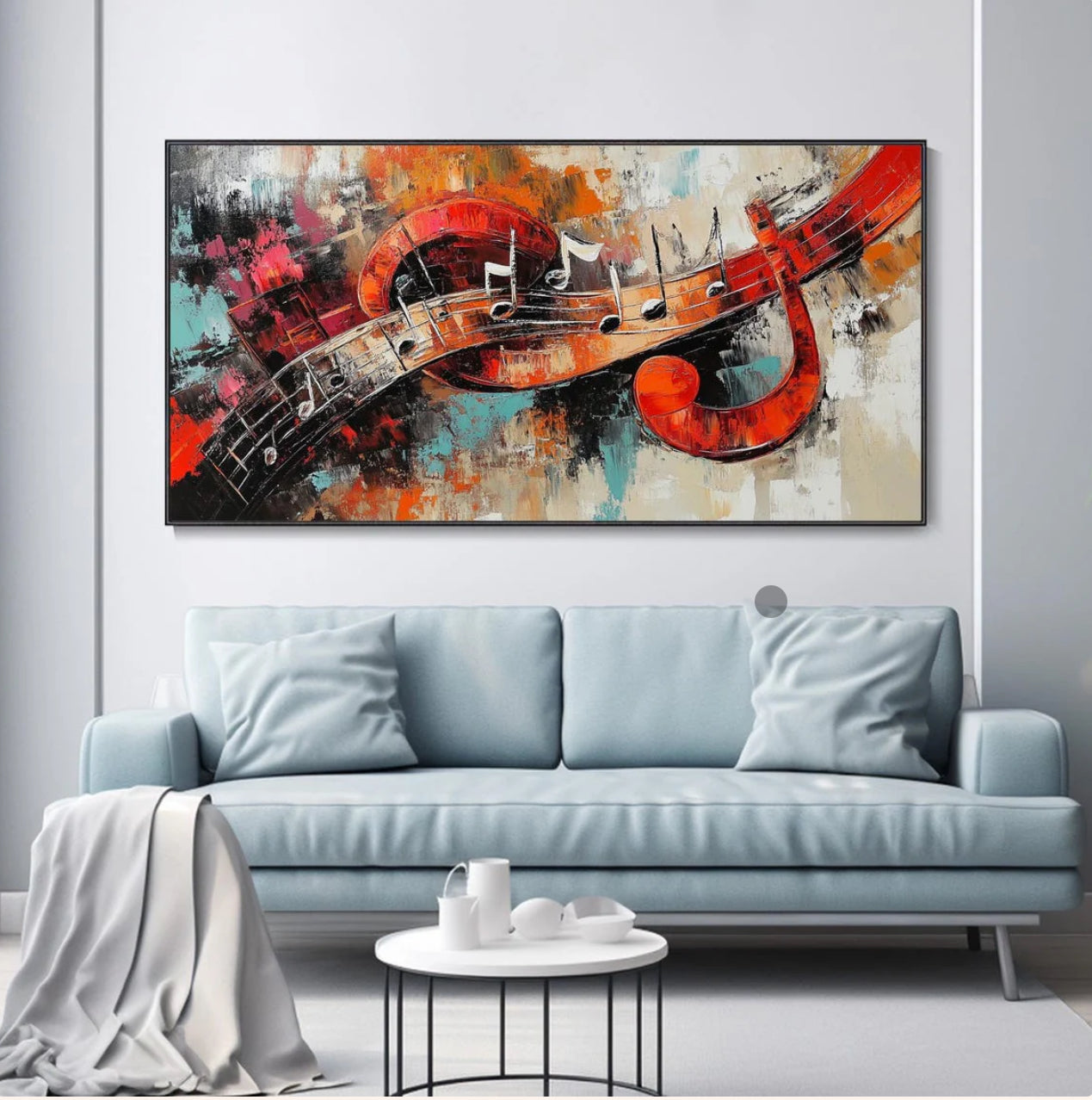 Swinging Melody is a burst of color and rhythm! The lively red curves of the treble clef swirl through musical notes, creating a visual symphony that fills your space with energy and charm. It’s not just art; it’s music for your eyes!