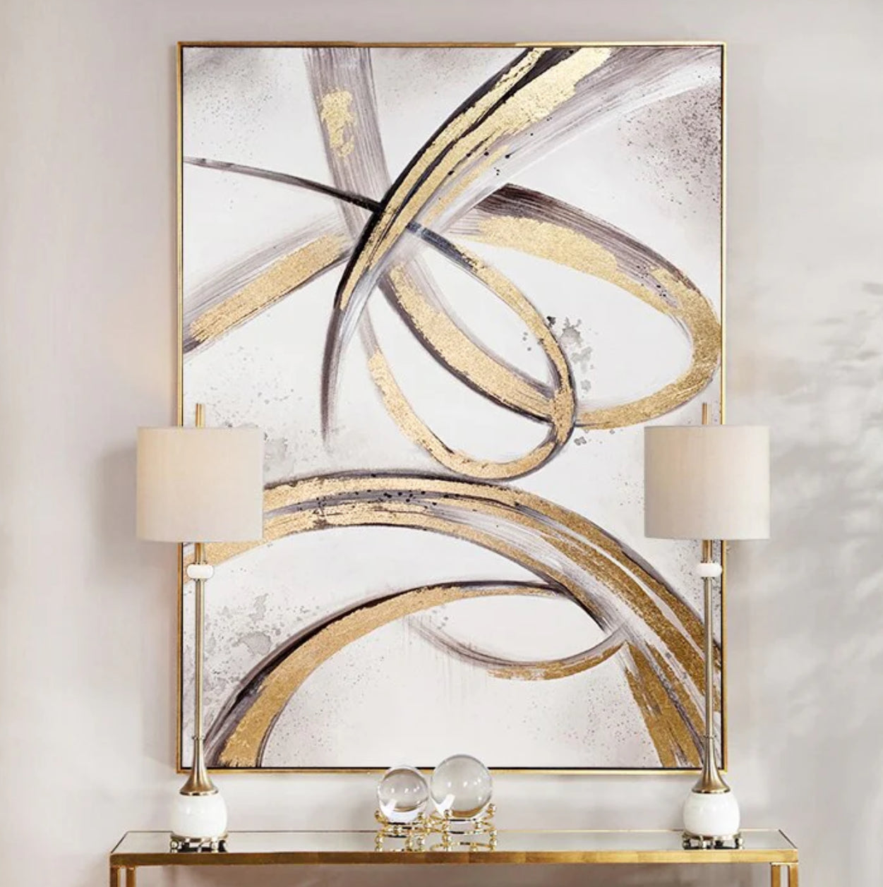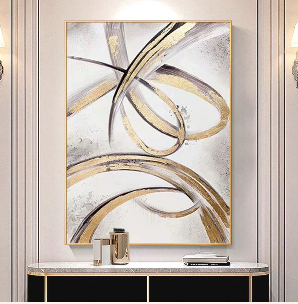 Stylish, elegant and dazzling with beauty! This fine art piece lights up any room or space with positive energy and uplifting colours. The beautifully composed golden strokes swirl across the pearl white background as one golden orchestra.