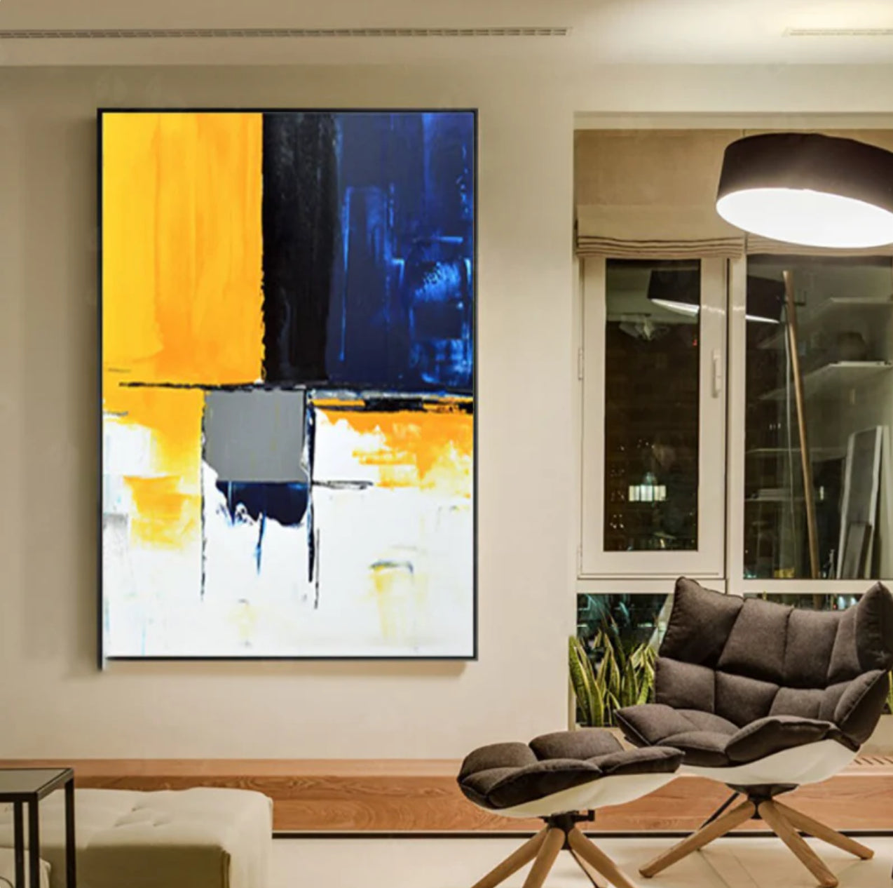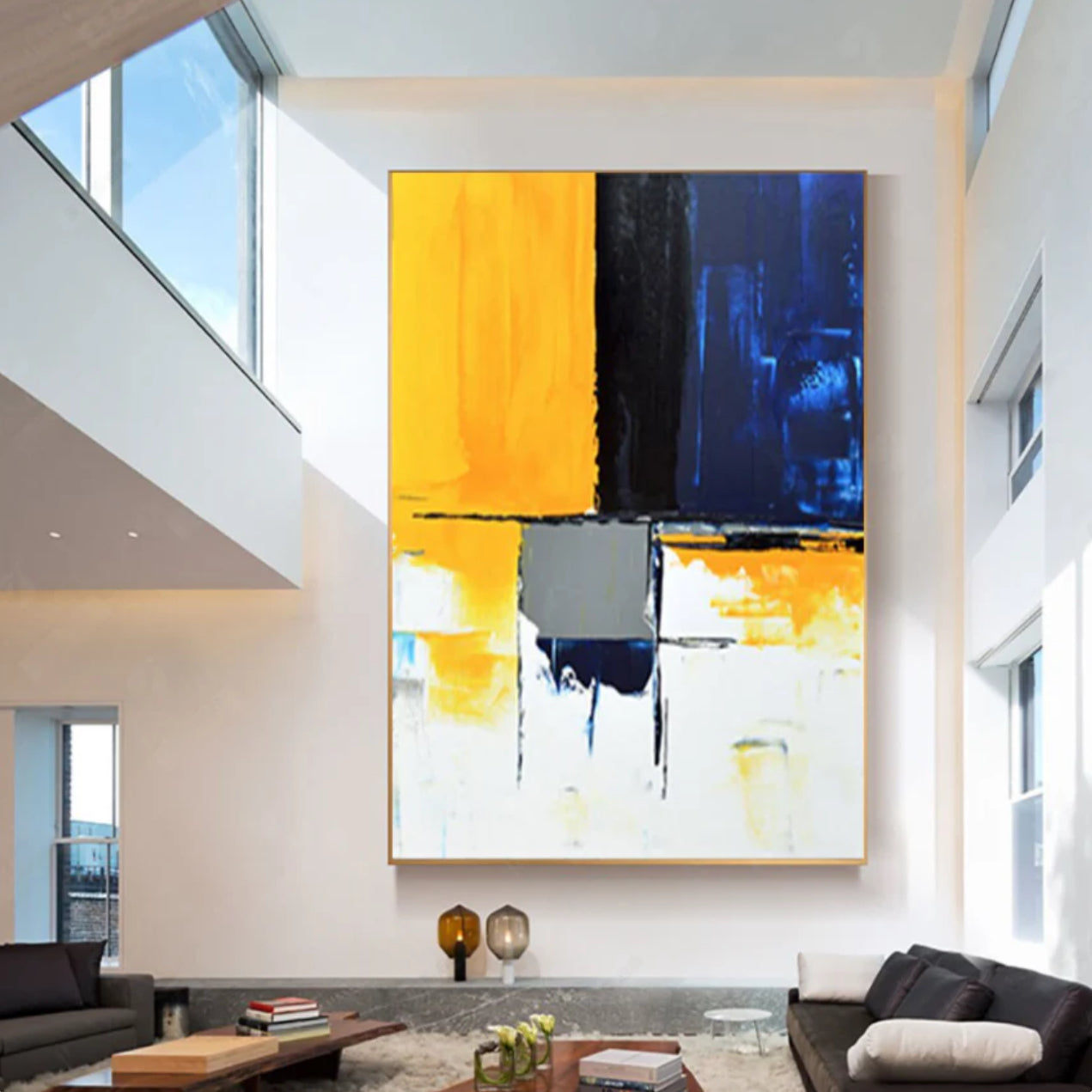 "Take a Seat invites you to sit back and enjoy its bold color palette. The striking contrast of yellow, blue, and black creates a dynamic visual experience, perfect for creating a modern elegance.