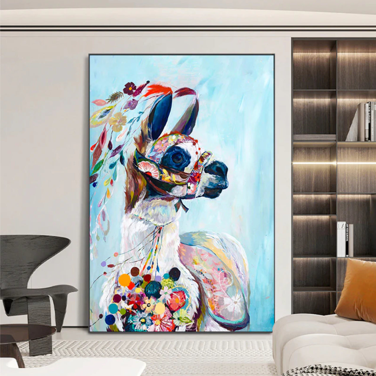 Isn't she beautiful with all her flower decorations? Her many vibrant colors make her a delight to look at. This jolly composition is perfect for adding a little color to your home interior, or creating a lovely atmosphere!