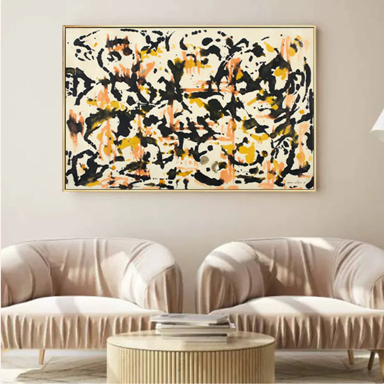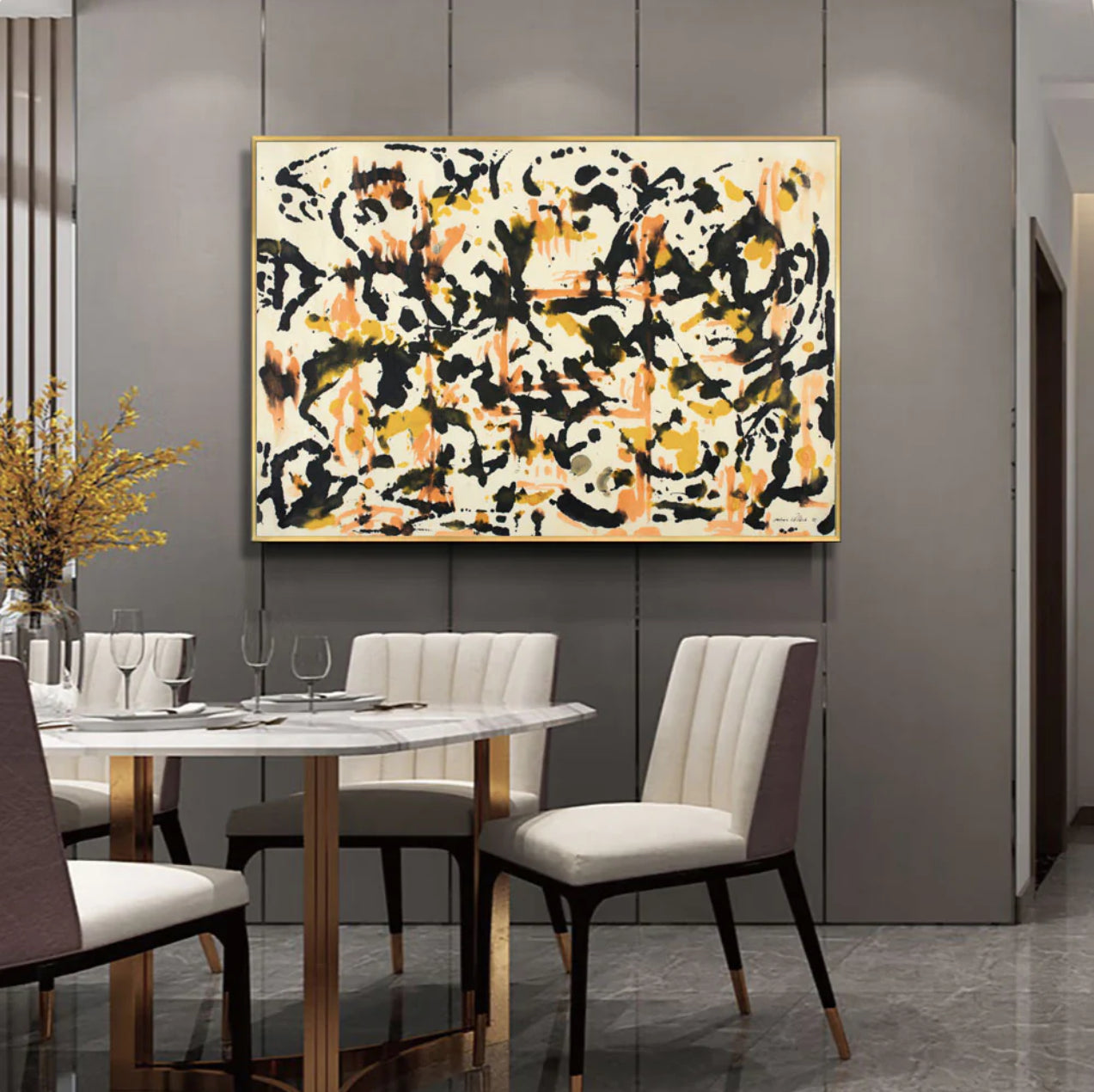 In the captivating artwork, a clean white canvas becomes a lively stage. Playful dots of black, yellow, and pink engage in a vibrant dance, drawing you for attention. Experience the joyful competition of colors, as they join in a lively contest of brightness and creativity.