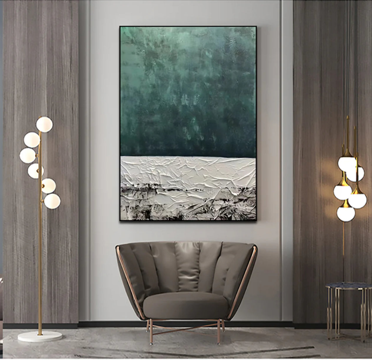 Step into 'The Dark Night' and let its mesmerizing textures and deep green colors lead you through the darkness. This painting captures the mystery of twilight, blending subtle movement and bold contrasts. It's perfect for anyone looking to bring intrigue and elegance into their space.