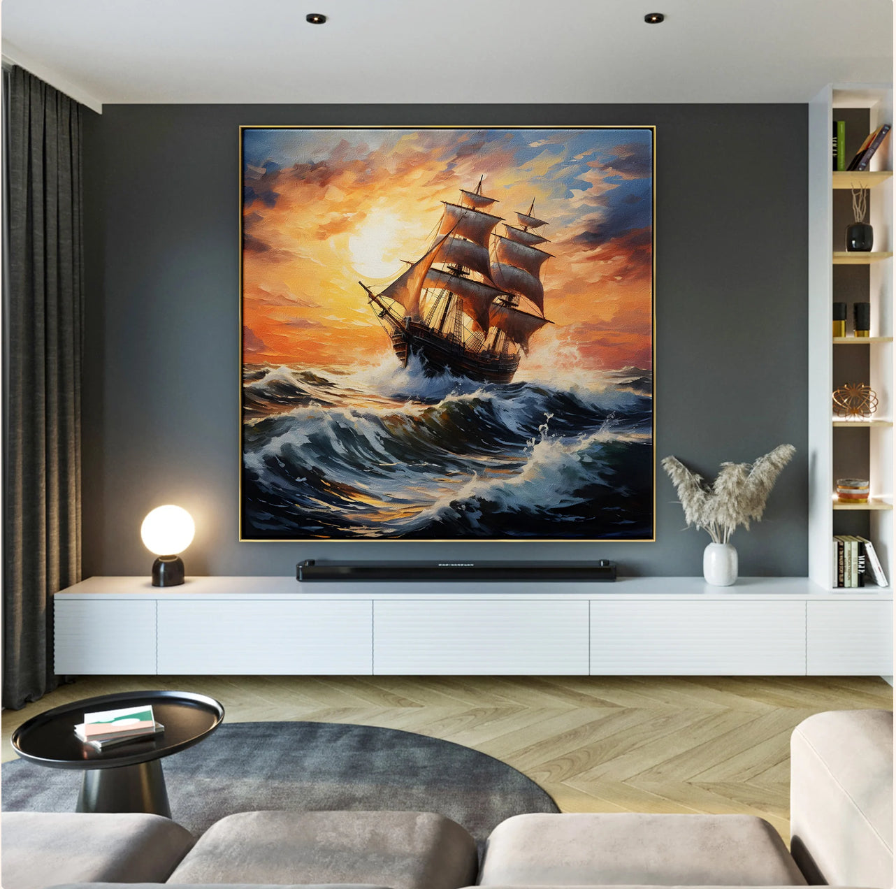 A magnificent sailing ship in turbulent waters, bathed in the golden glow of the setting sun. The Eurydice invies you to embark on an adventure that leads you into the beauty of twilight.