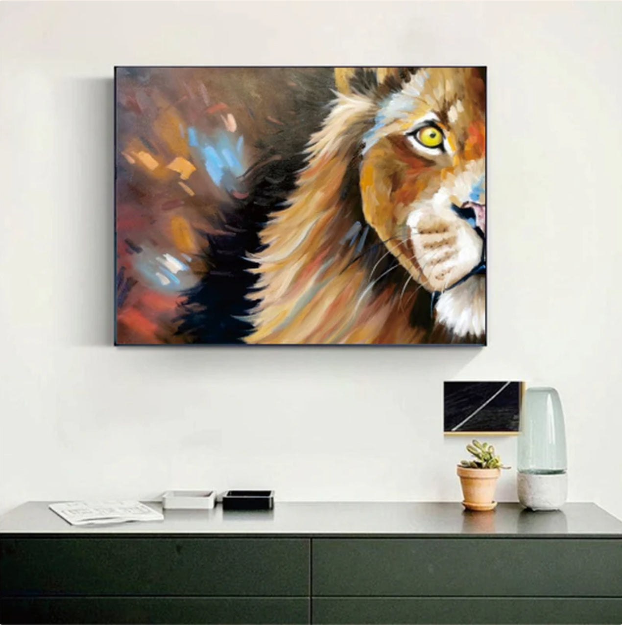 In this captivating portrait, a majestic lion locks eyes with you in ""The Hunter."" The intensity of the gaze displays strength and determination, while the artist's skillful brushstrokes bring out the wild elegance, making it a powerful addition to any home interior.
