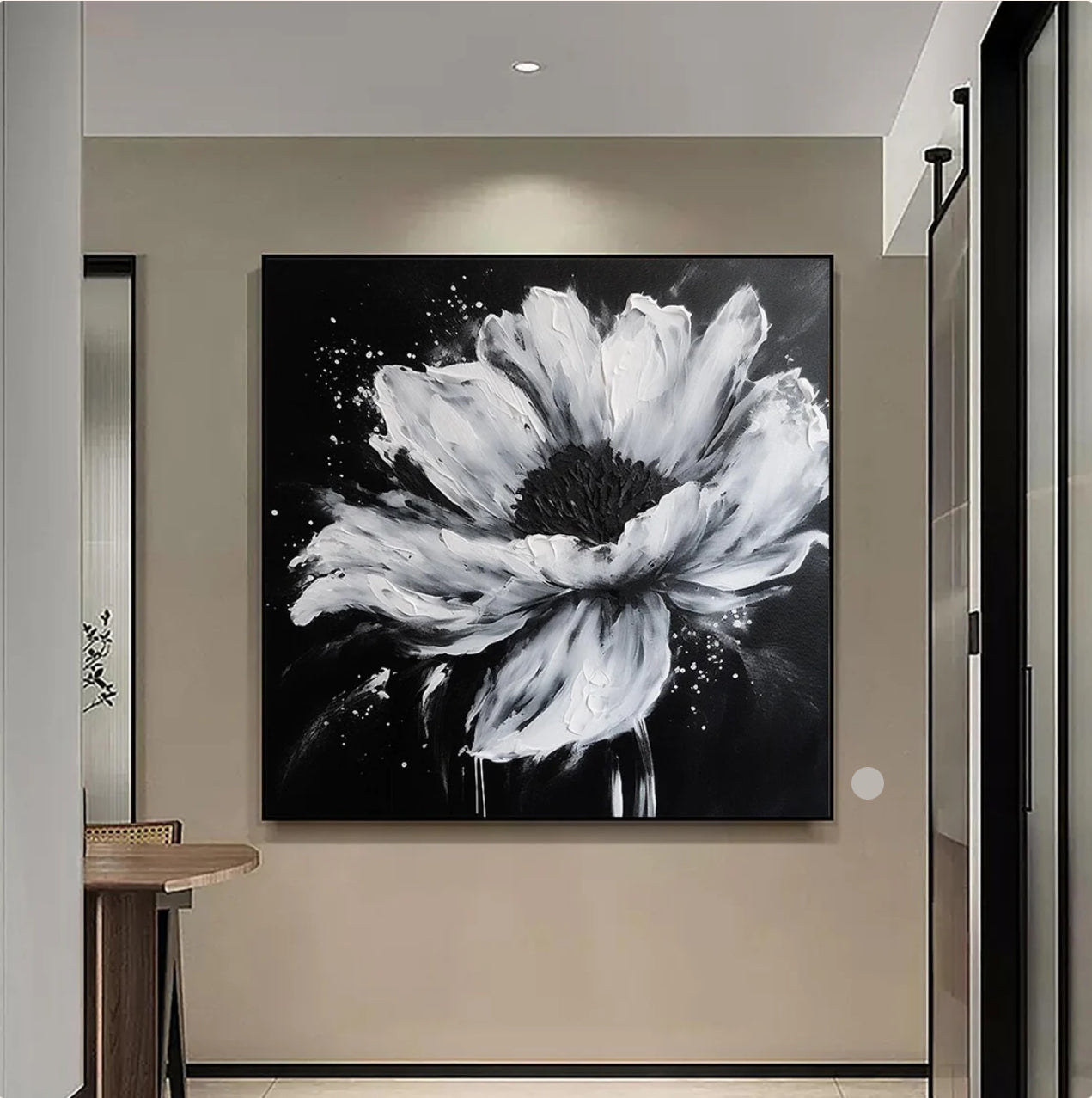 Black and white has never looked so vibrant. This captivating floral artwork combines striking contrasts with textured details, bringing a modern edge to timeless beauty. Let this bold flower add sophistication and drama to your walls.