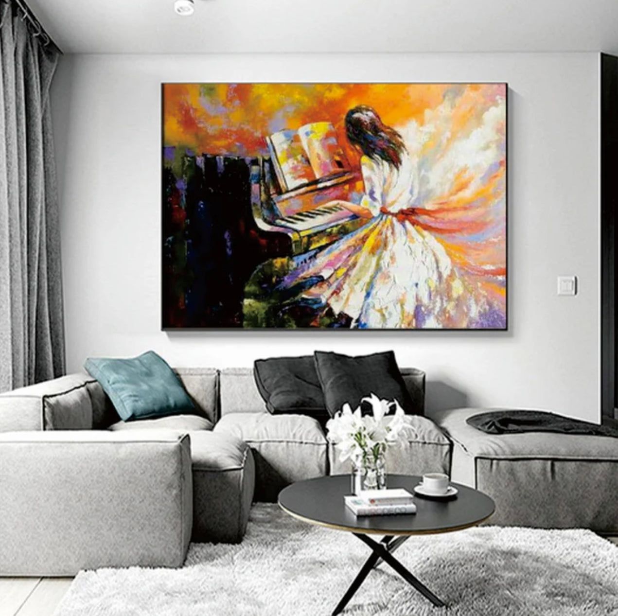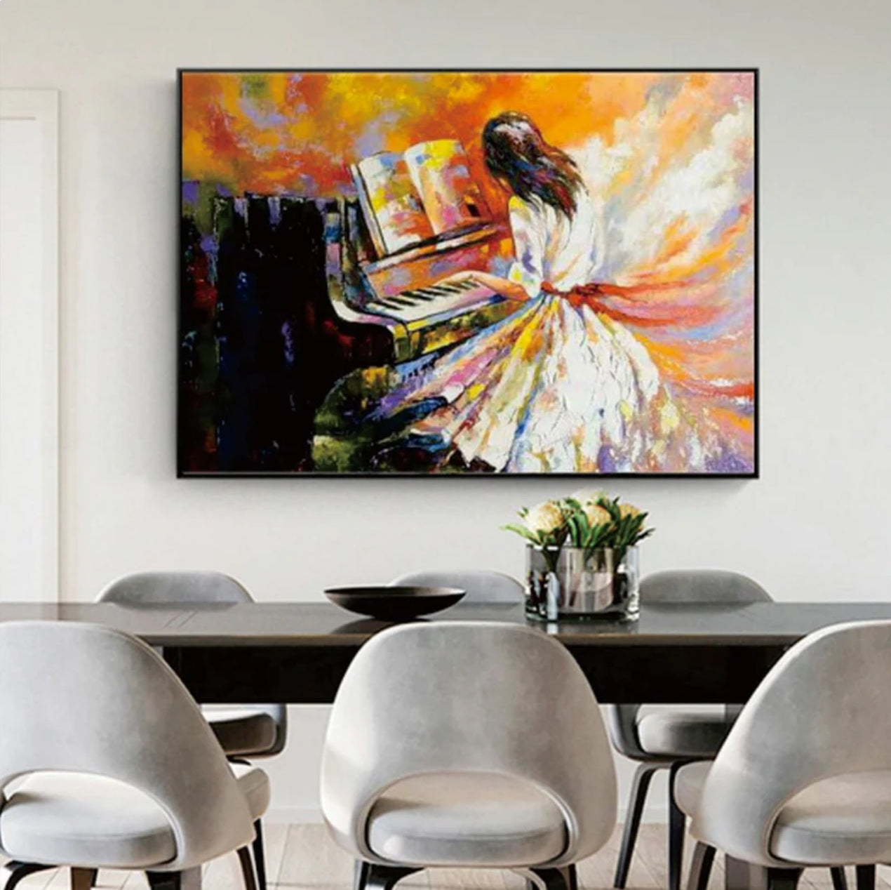 When we look at this wonderful painting, we can almost hear the music flowing out of the canvas. With a captivating color scheme and a great impressionistic style, this lady pianist will steal your heart! Can you make out what she's playing?
