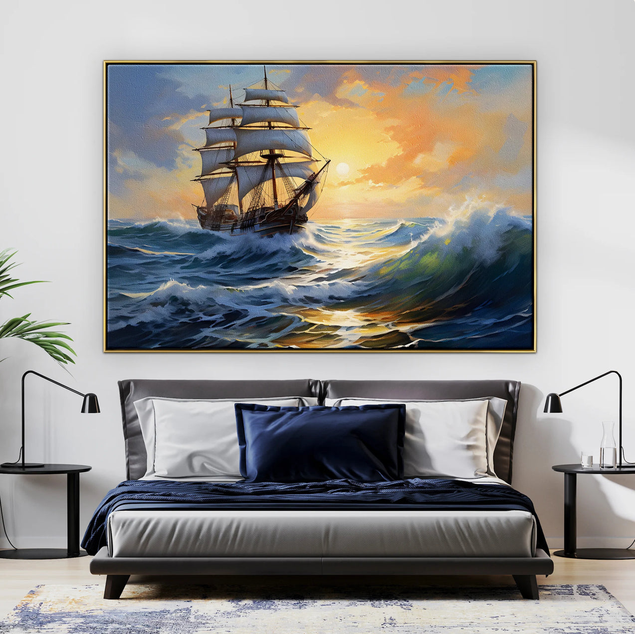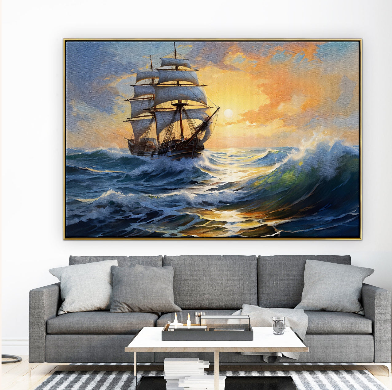 Step aboard 'The Voyager' and set sail on a majestic sunset odyssey. Realistic waves dance at the prow of the ship, creating a wondrous piece that invites you to the open sea.
