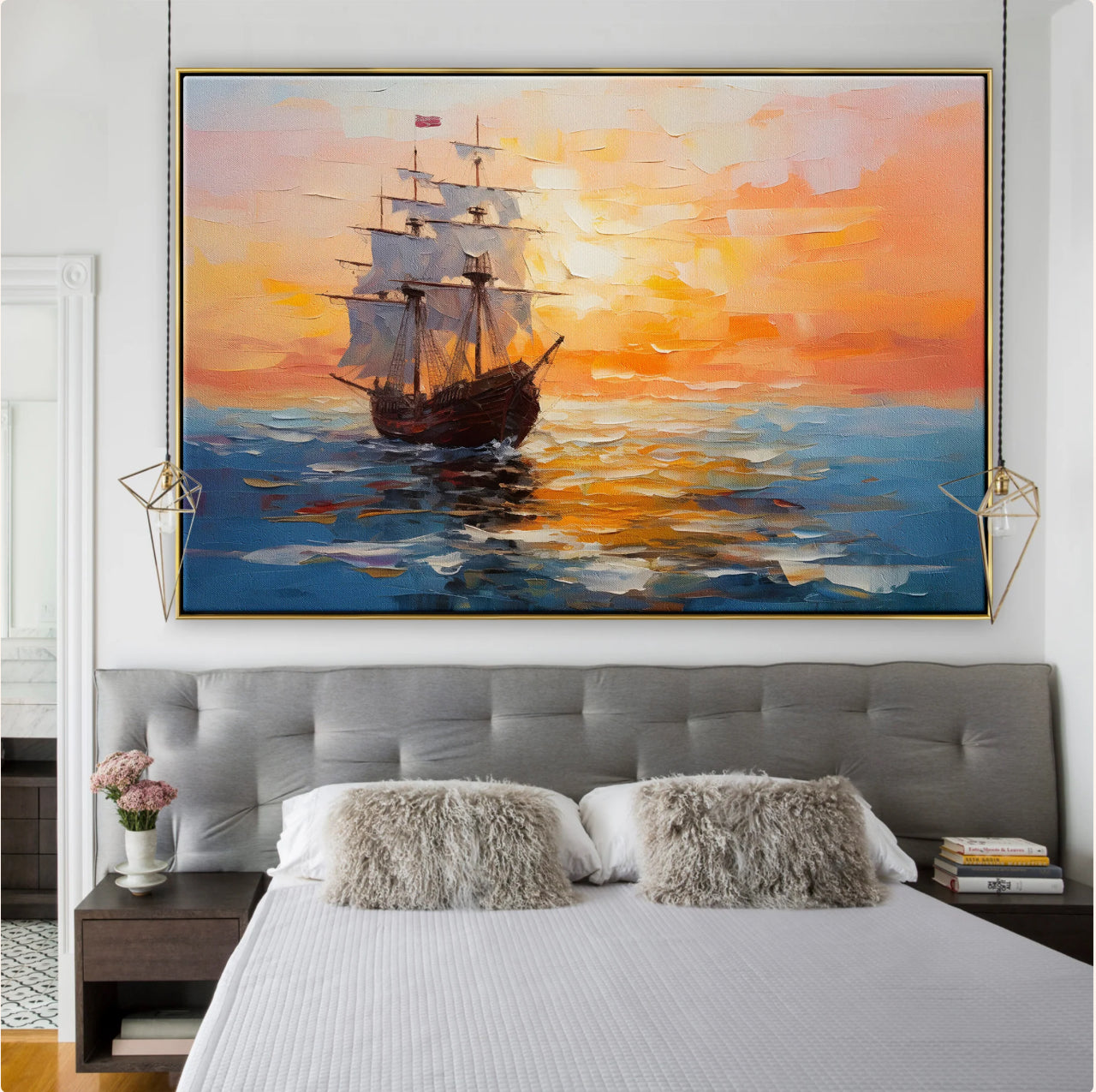 As the sun dips below the horizon in 'The Wayfarer,' the ship sails on in an impressionistic landscape. This piece captures the essence of dreams, adventures, and the allure of the open sea.