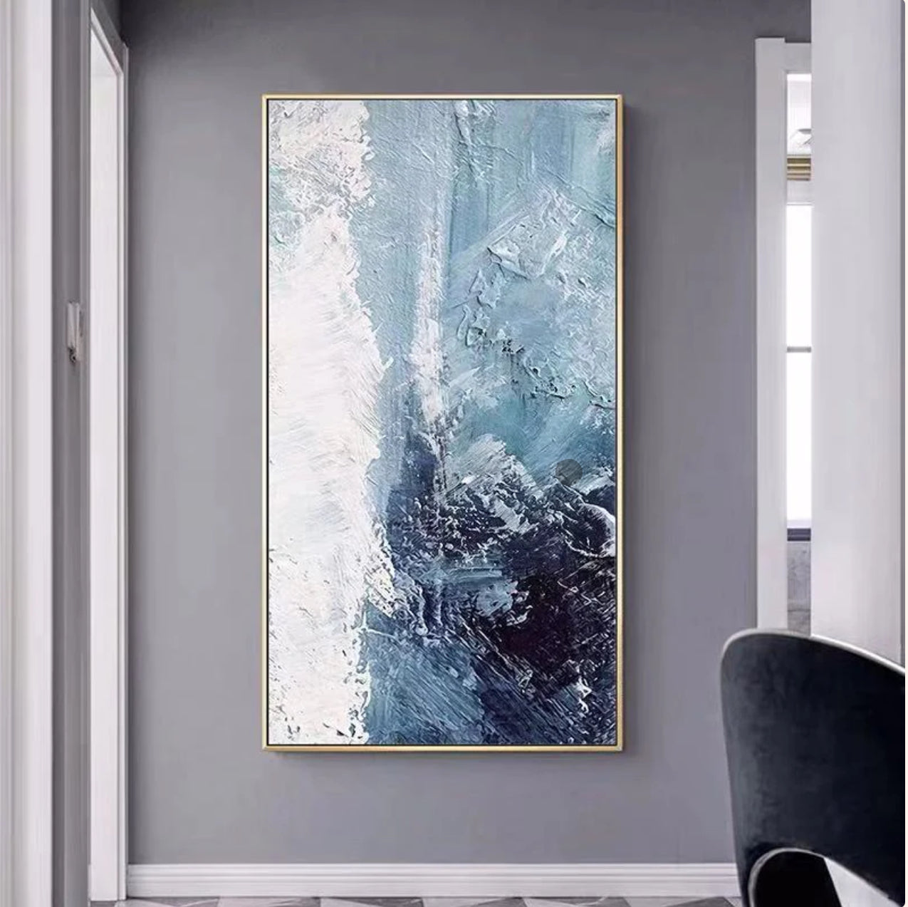 A mysterious wave washes ashore, where movement meets stillness and where fluid meets solid. Through thick layers of white paint, the artist created a hyper-realistic beach foam. Its many different shades of blue give the tide beautiful movement and realistic depth.